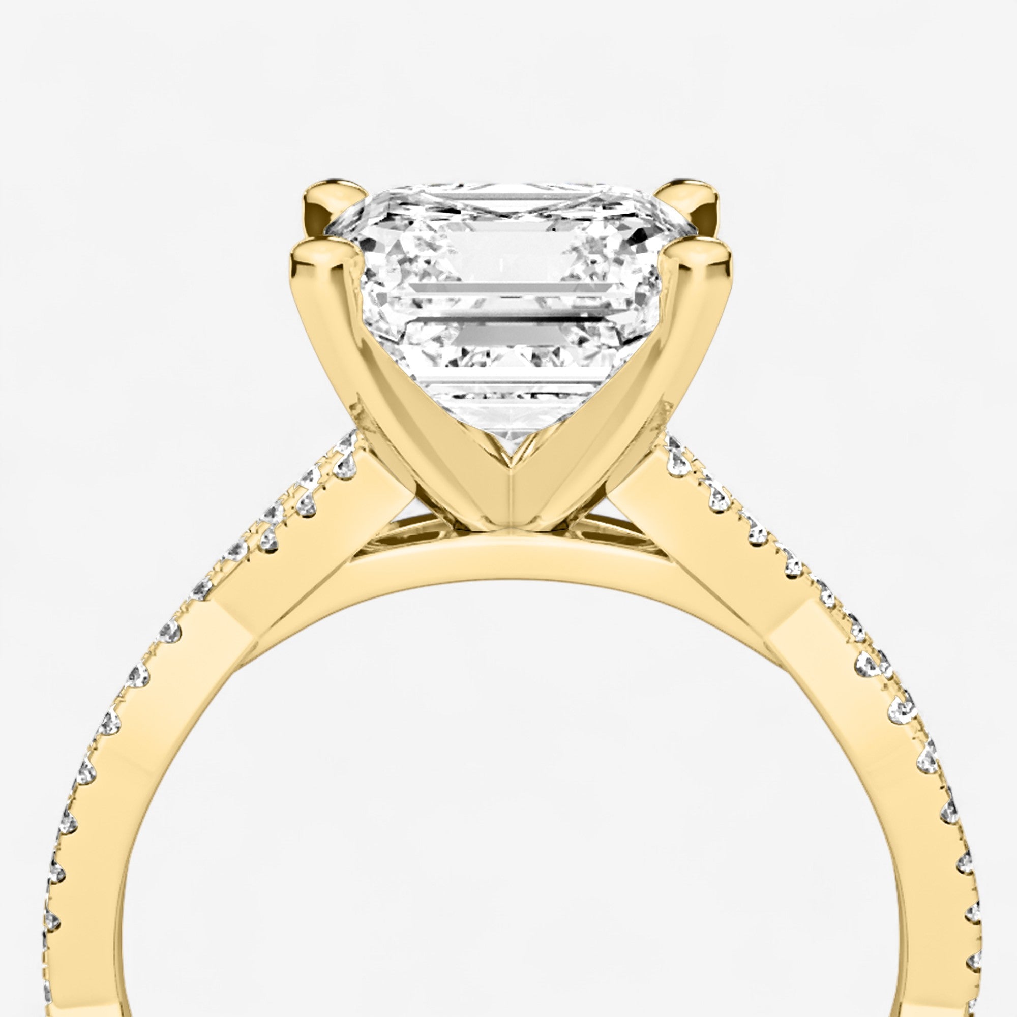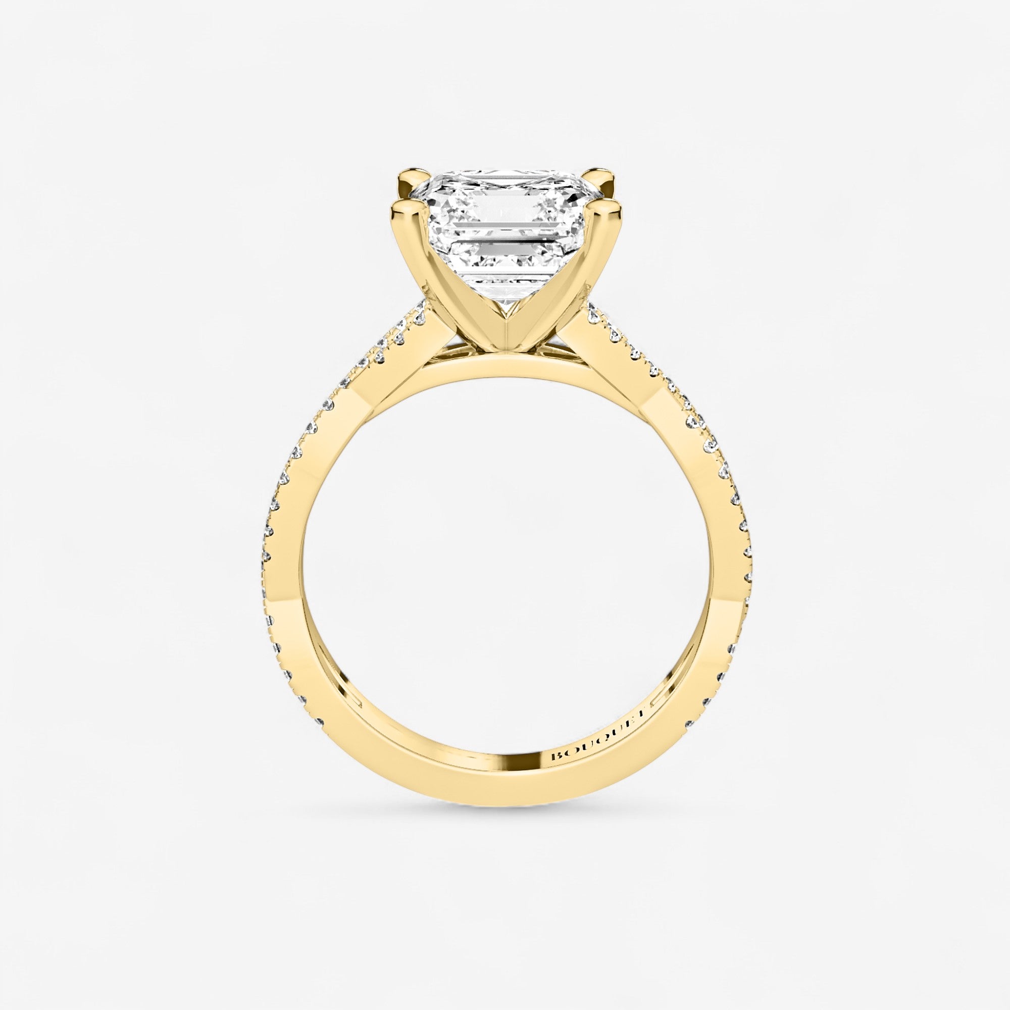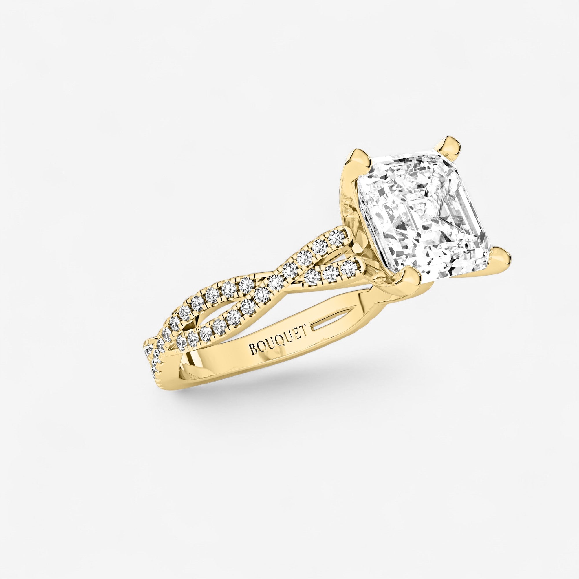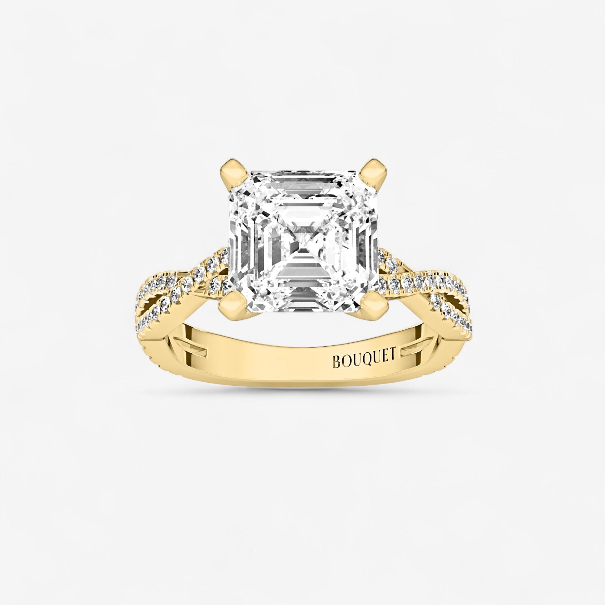 Gracefully intertwining bands form a double twist design, cradling the remarkable center stone in this side stone engagement ring. Crafted in luminous 14K gold and adorned with exquisite asscher and round lab grown diamonds, it carries a poetic charm that is at once modern and timeless. Each detail, from the prong settings to the artful twists, speaks of exceptional craftsmanship and a celebration of enduring love.