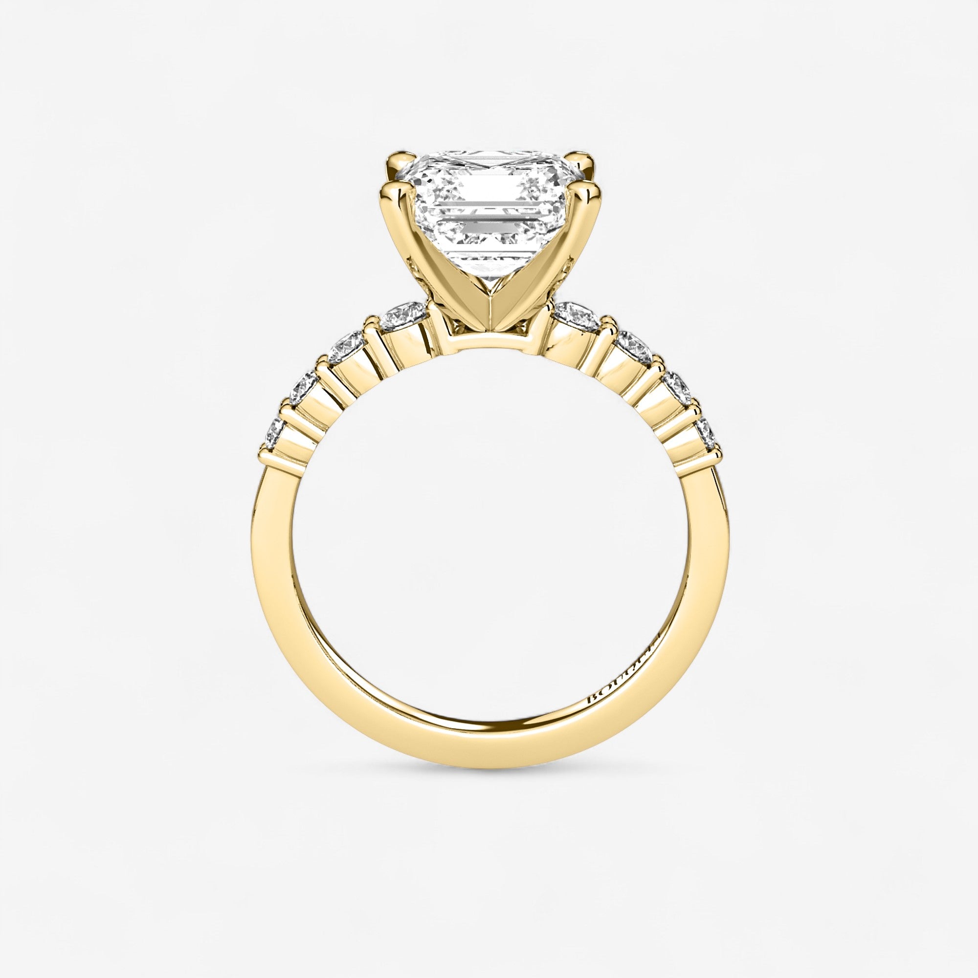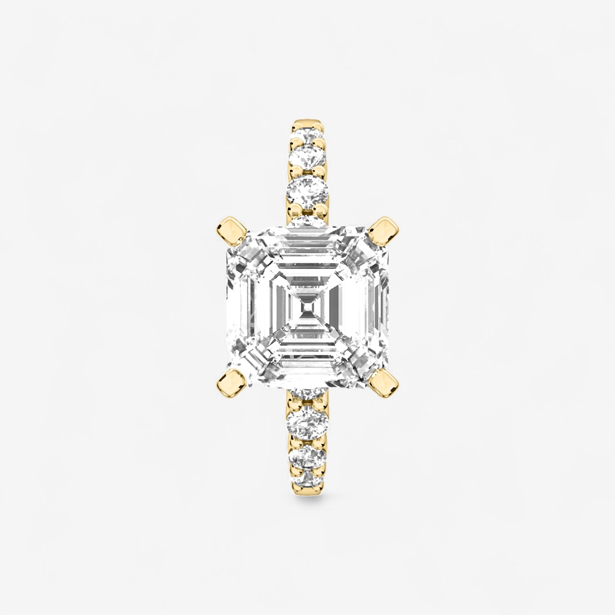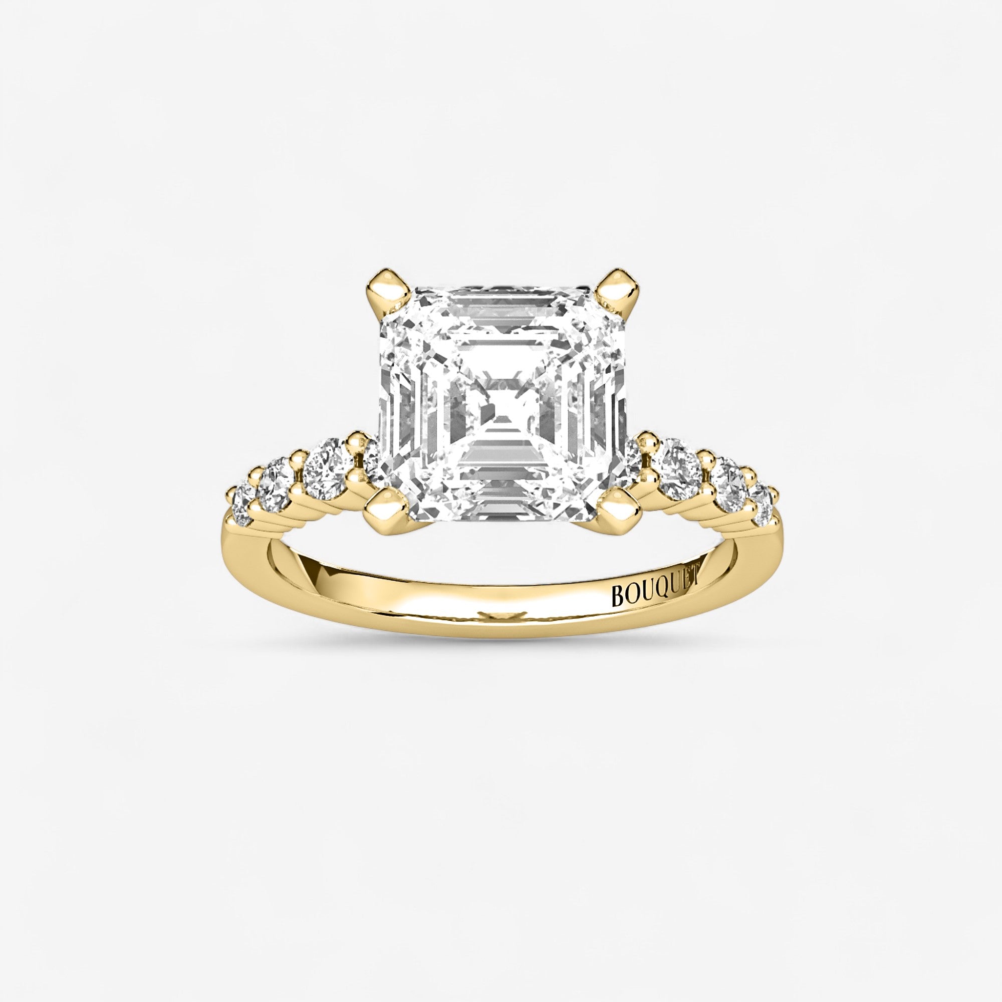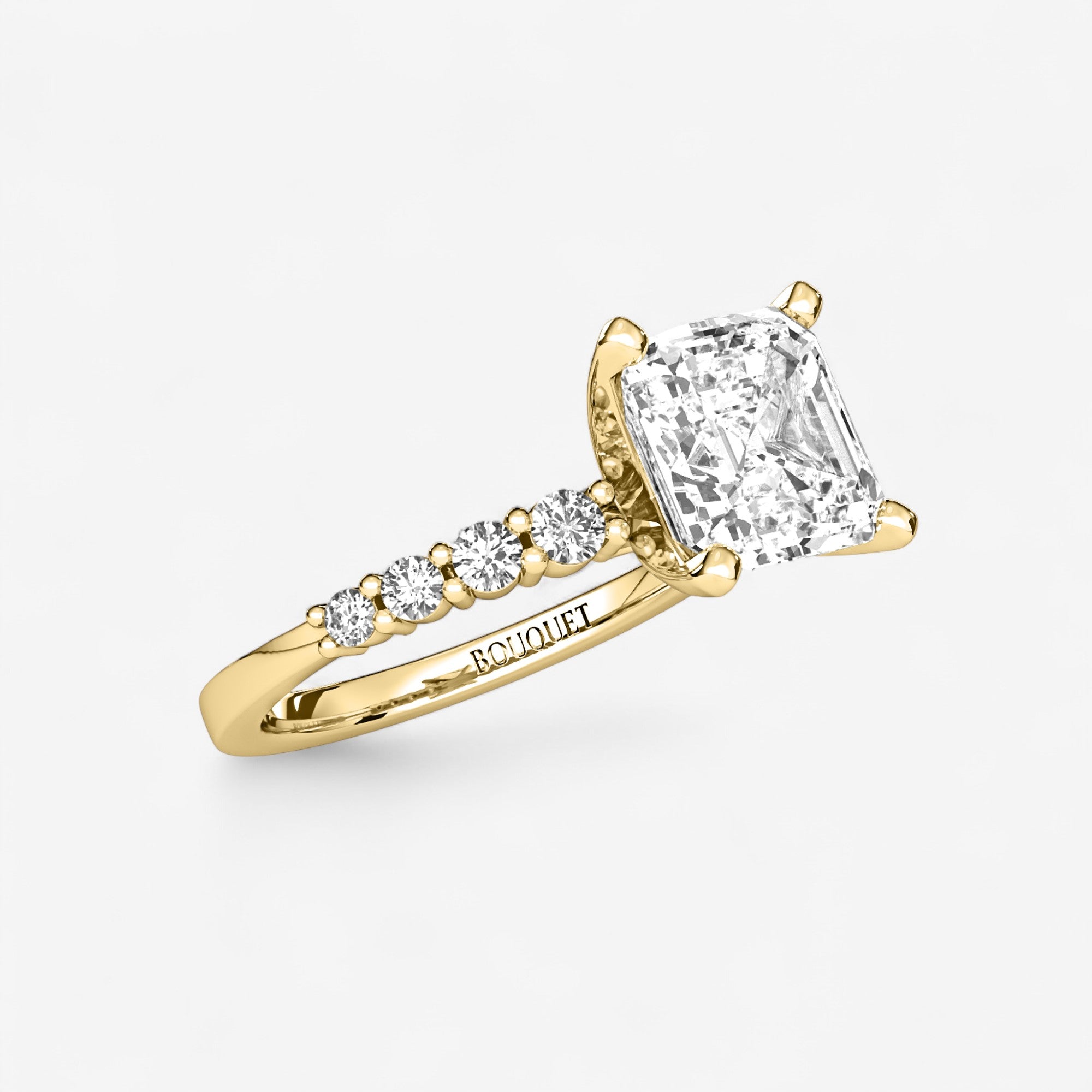 Each detail of this graduated side stone engagement ring is a study in artistry, culminating in a design that feels both modern and enduring. Crafted in gold or platinum, the ring showcases a timeless arrangement of Asscher and Round lab grown diamonds, their alignment a celebration of precision and beauty. The prong setting elevates the diamonds, allowing them to catch the light with every movement, creating an unforgettable presence.