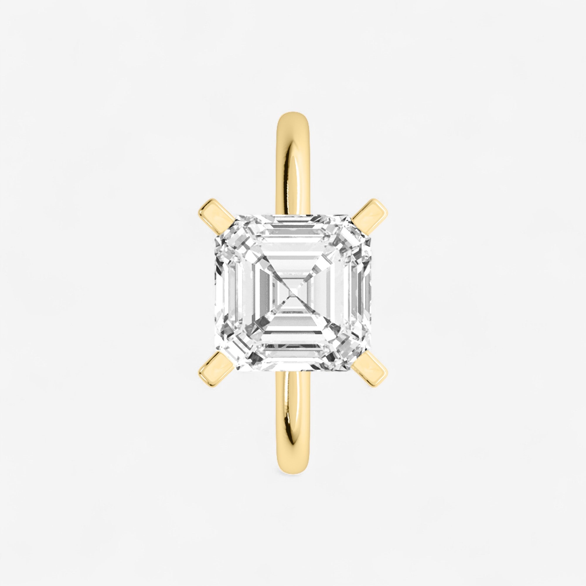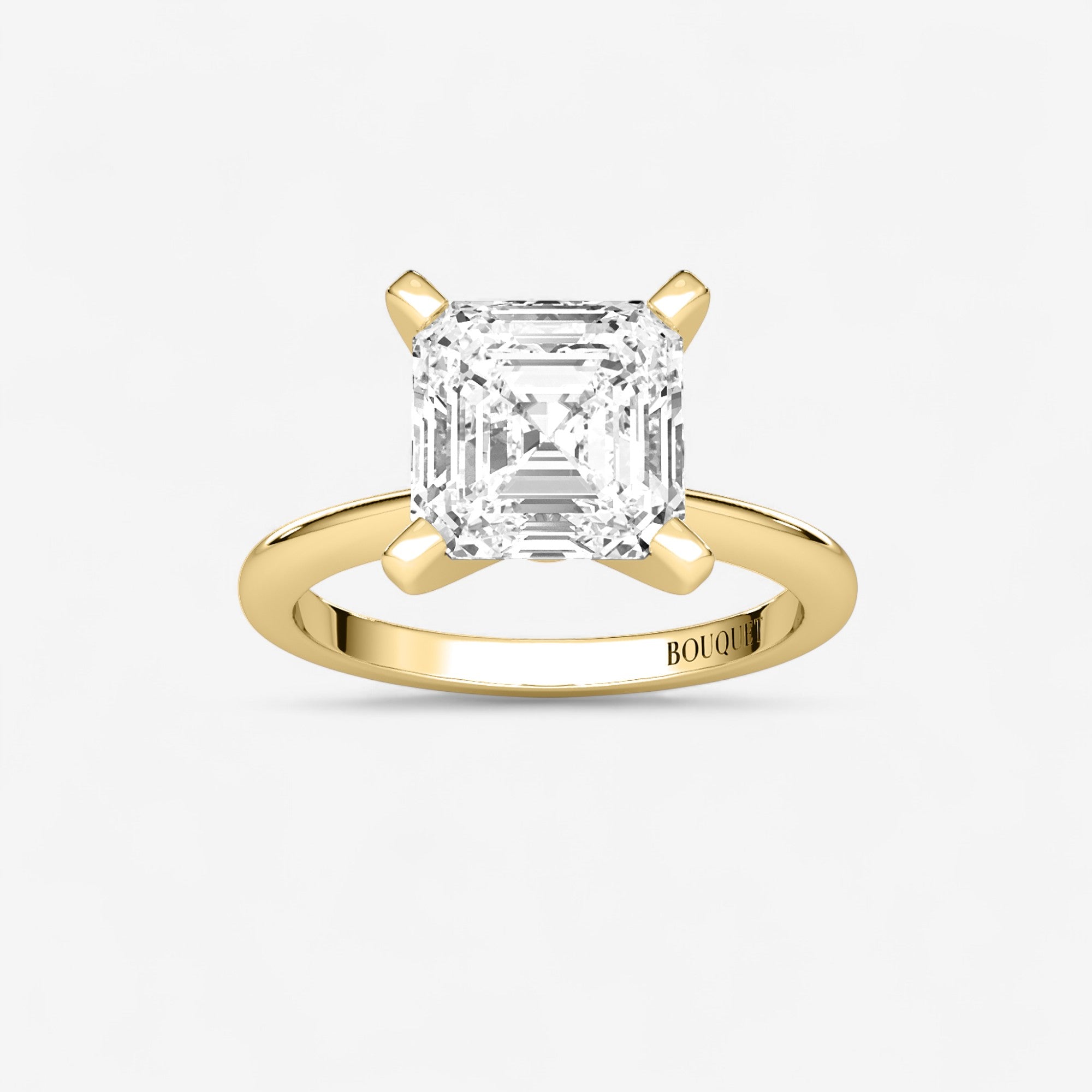 A classic symbol of commitment, this petite solitaire engagement ring showcases refined elegance. Centered with a lab-grown Asscher cut diamond, it is set on a smooth 14K gold or platinum band, secured by a precise prong setting that brilliantly enhances its sparkle. This ring reflects timeless love and exceptional craftsmanship.