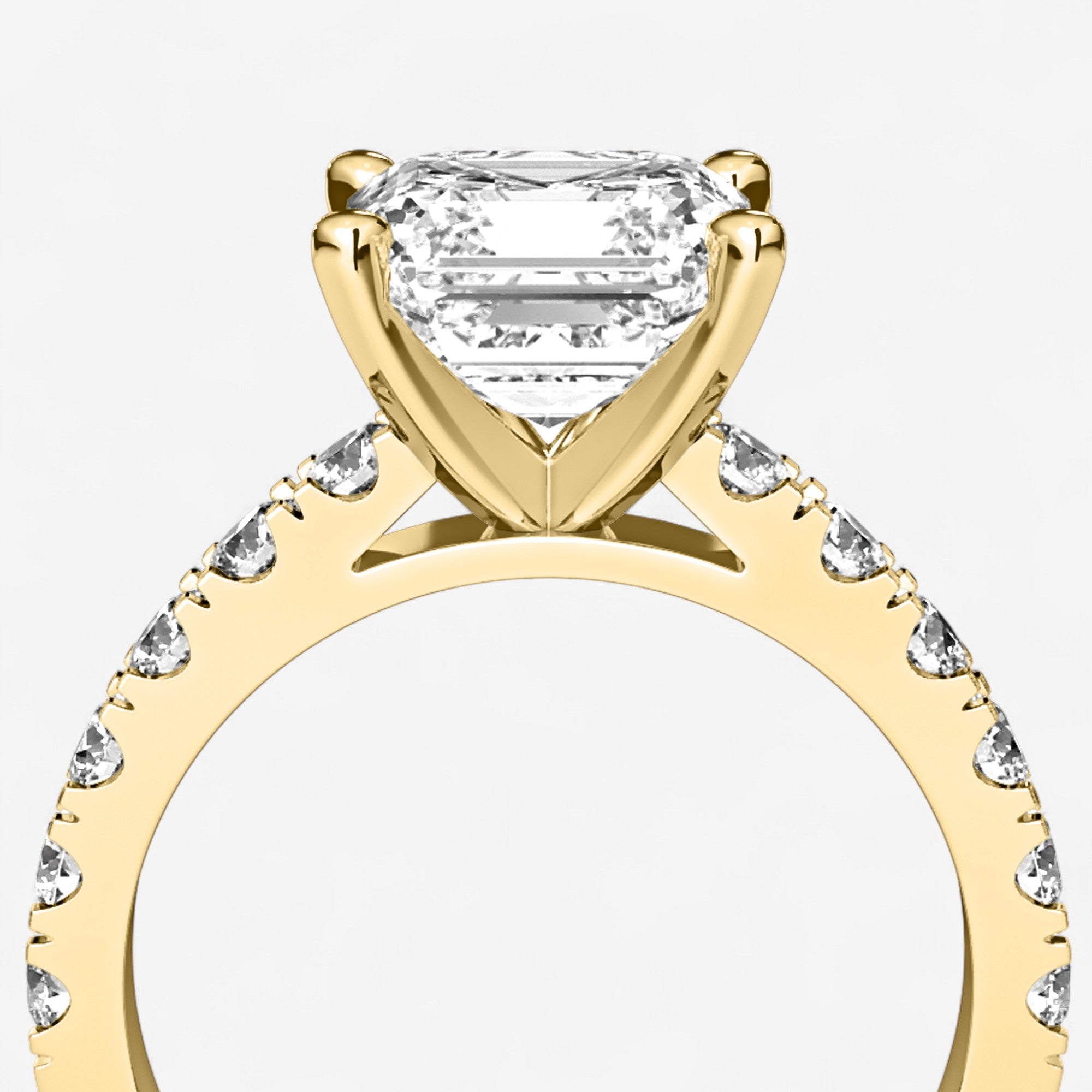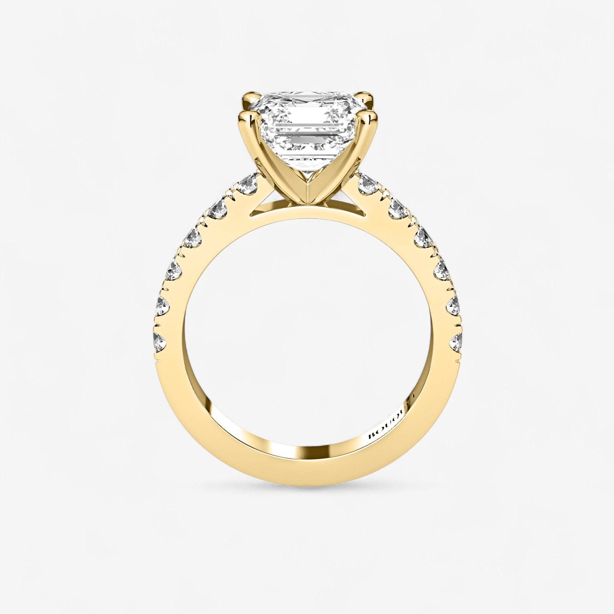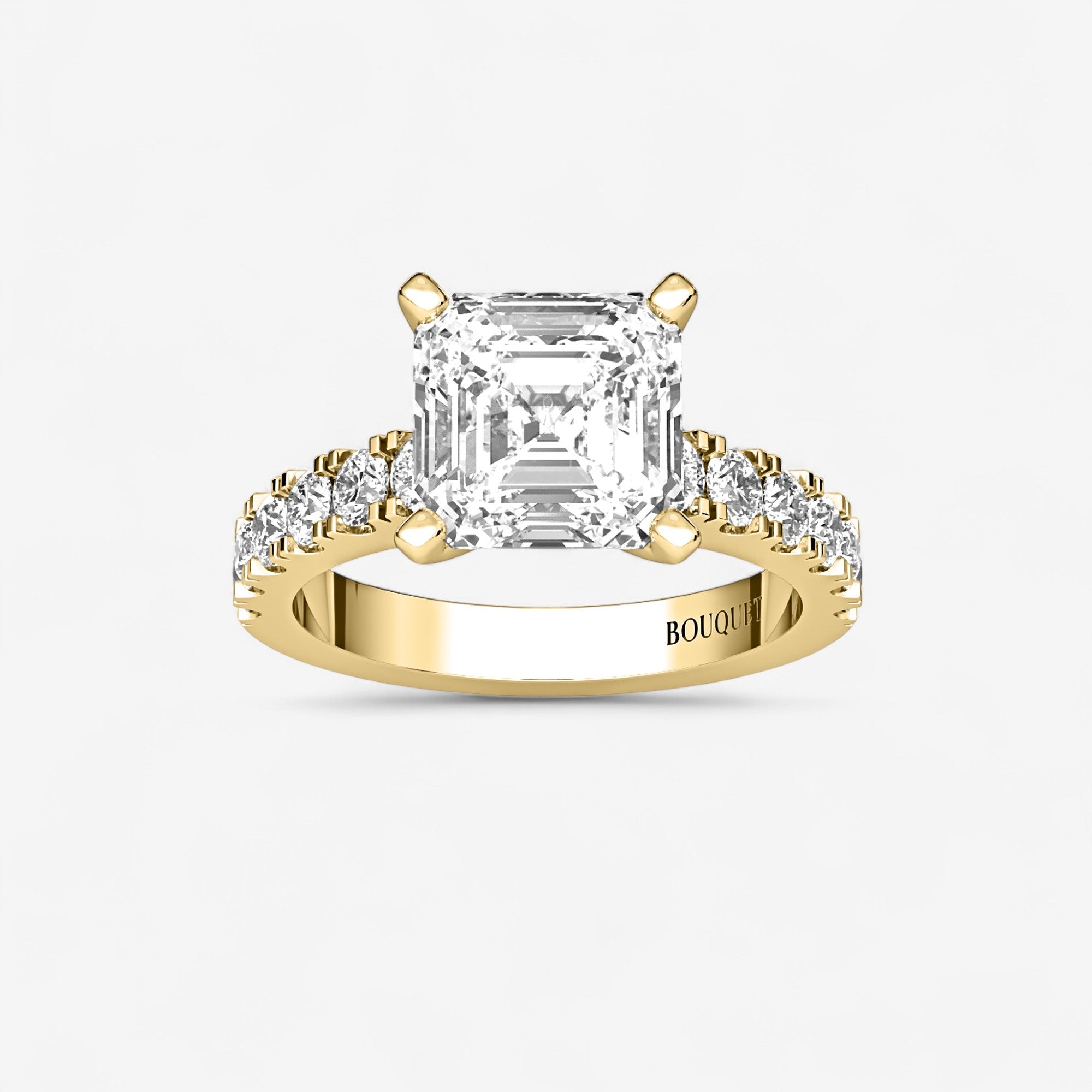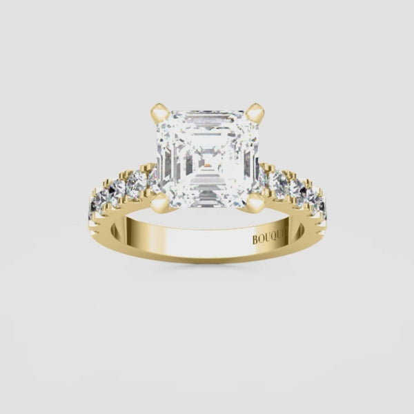 This exquisite engagement ring highlights a brilliant asscher cut center diamond set in classic gold or platinum, elevated by a row of sparkling side stones secured in a refined split prong setting. The split prongs allow for more light to enter each diamond, creating extra brilliance while giving the design a graceful, open look. Balancing timeless elegance with modern craftsmanship, this ring is a radiant expression of love designed to be cherished for a lifetime.