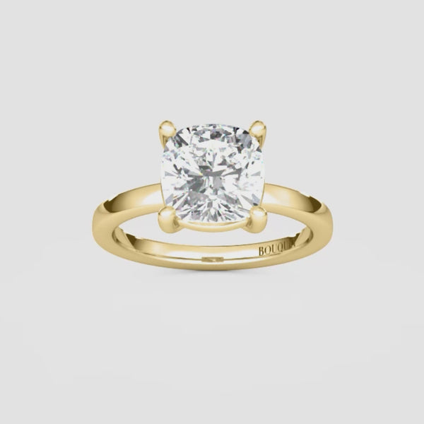This solitaire engagement ring exudes refined elegance, embodying the essence of pure love through its classic design. Featuring a cushion lab-grown diamond set delicately in a timeless four prong setting, with a basket underneath to provide extra security, it shines brilliantly atop a band available in 14K gold or platinum. Meticulous craftsmanship highlights every detail, resulting in a sophisticated symbol of devotion.
