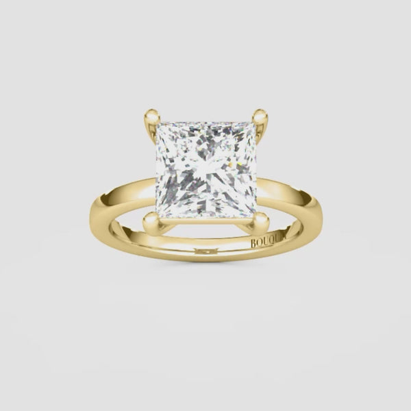 This solitaire engagement ring captures timeless elegance, symbolizing true love with its classic style. It showcases a lab-grown princess diamond secured by a traditional four-prong setting, reinforced with a basket for added stability. The gemstone rests gracefully on a band crafted from either 14K gold or platinum. Every element is thoughtfully designed and expertly finished, making it a distinguished emblem of commitment.