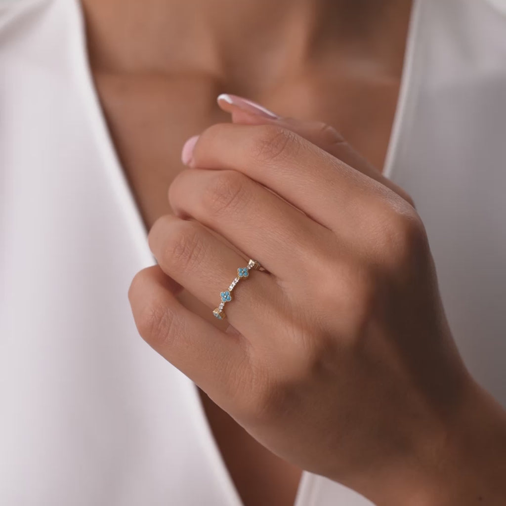 Indulge in the ultimate symbol of royalty with our Clover Turquoise and Diamond Eternity Band. This unique and stunning piece features the iconic clover shape adorned with exquisite turquoises, creating a look that is truly fit for a queen. Elevate your style and feel like royalty with every wear.