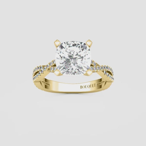 This 14K gold or platinum ring features an elegant double twist motif, blending artistry with masterful craftsmanship. At its heart lies a cushion-cut lab-grown diamond, embraced by round diamonds set in prongs, offering a balanced interplay of brilliance and shape. Crafted as a side stone engagement ring, it embodies deep connection and enduring commitment, destined to enchant for a lifetime.