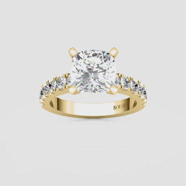 This exquisite engagement ring highlights a brilliant cushion center diamond set in classic gold or platinum, elevated by a row of sparkling side stones secured in a refined split prong setting. The split prongs allow for more light to enter each diamond, creating extra brilliance while giving the design a graceful, open look. Balancing timeless elegance with modern craftsmanship, this ring is a radiant expression of love designed to be cherished for a lifetime.