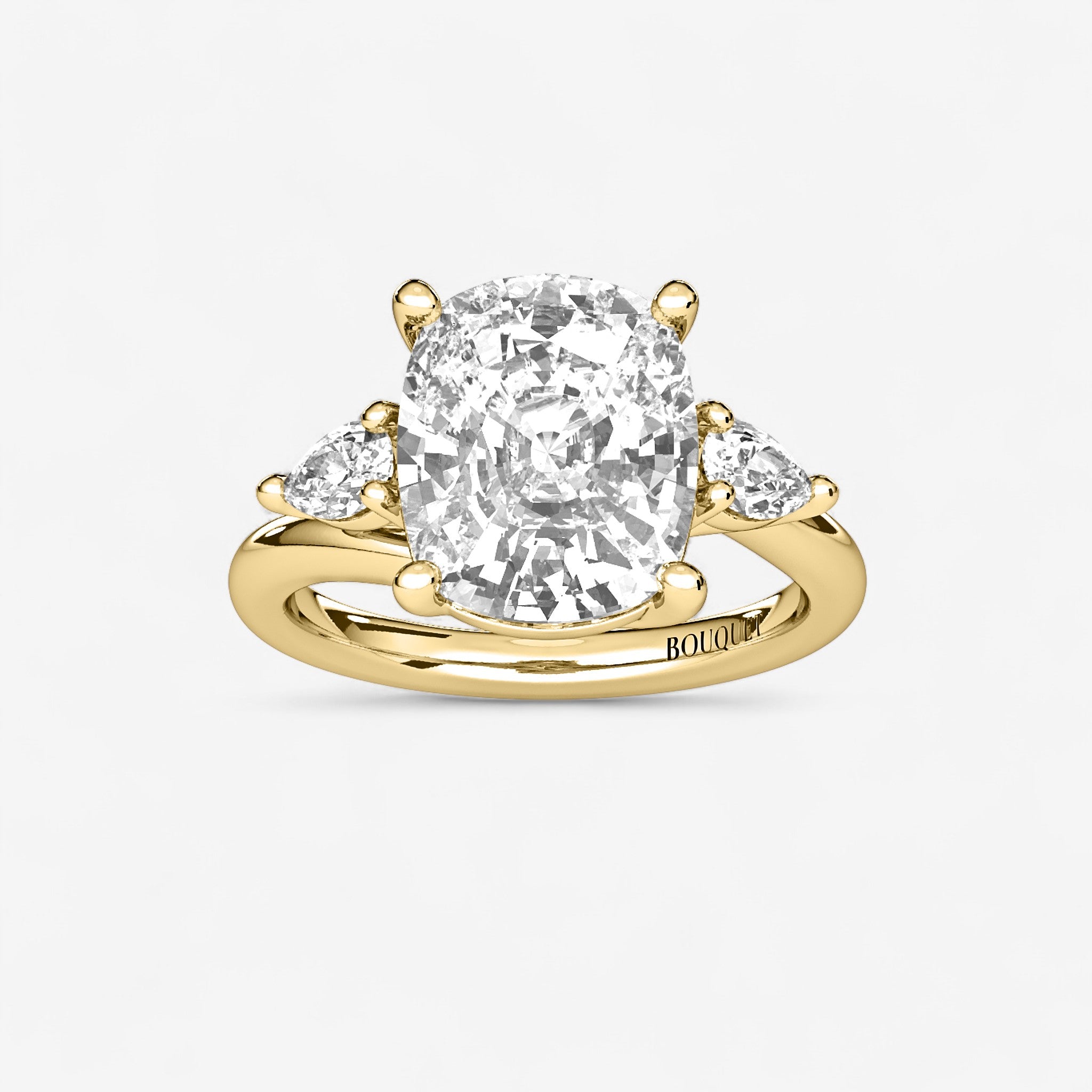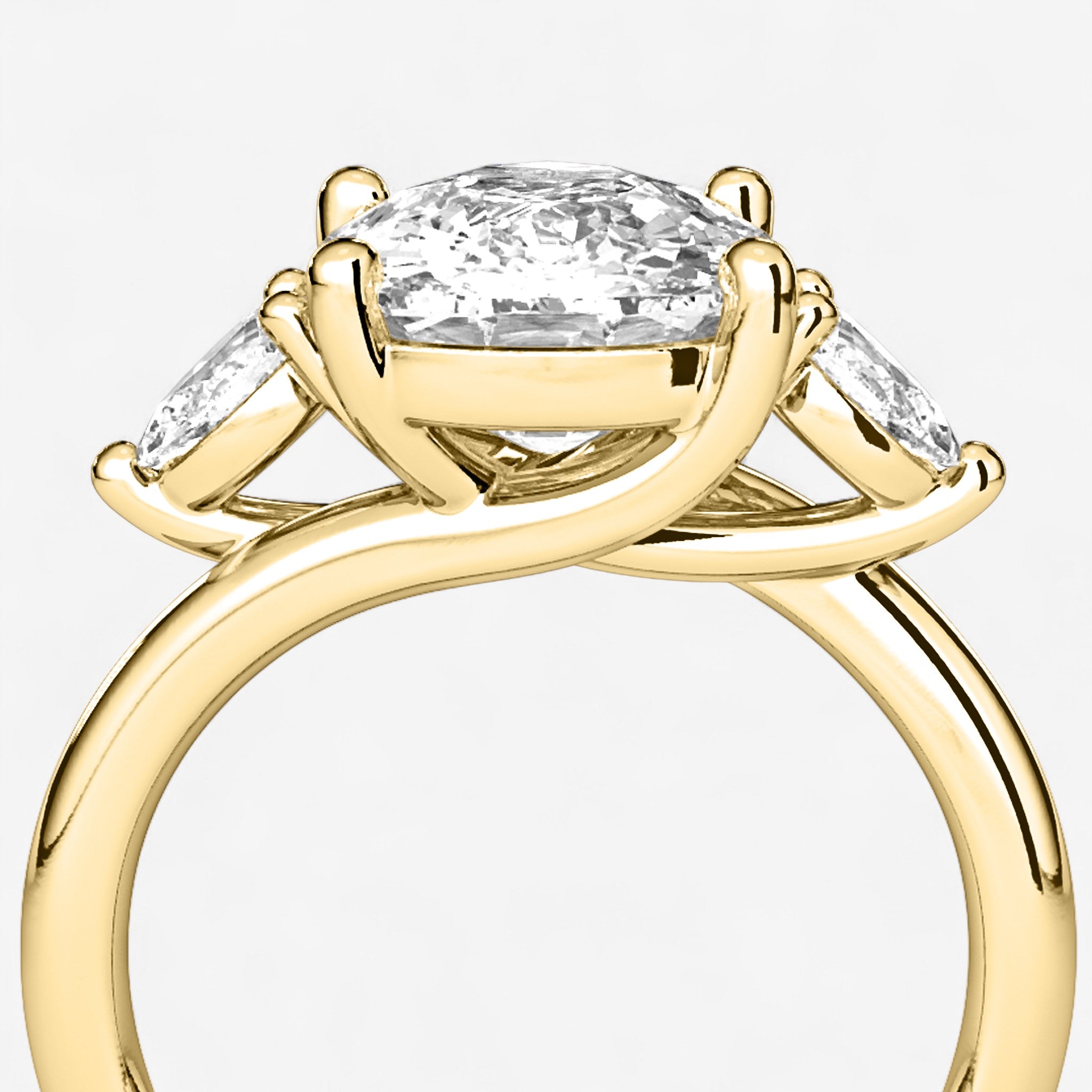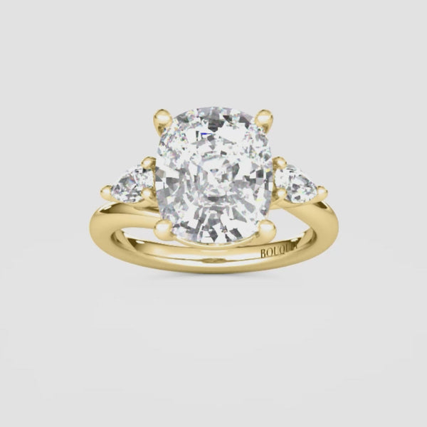 This exquisite three-stone engagement ring showcases a brilliant elongated cushion diamond as its focal point, complemented by two elegant pear-shaped stones nestled in a curved trellis setting. Featuring lab-grown diamonds throughout, this design combines modern luxury with classic sophistication, offering a distinctive silhouette that celebrates both brilliance and refined taste.