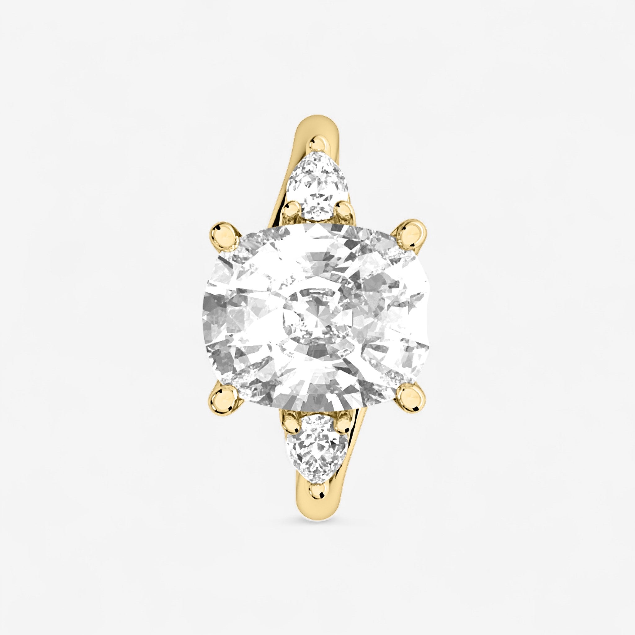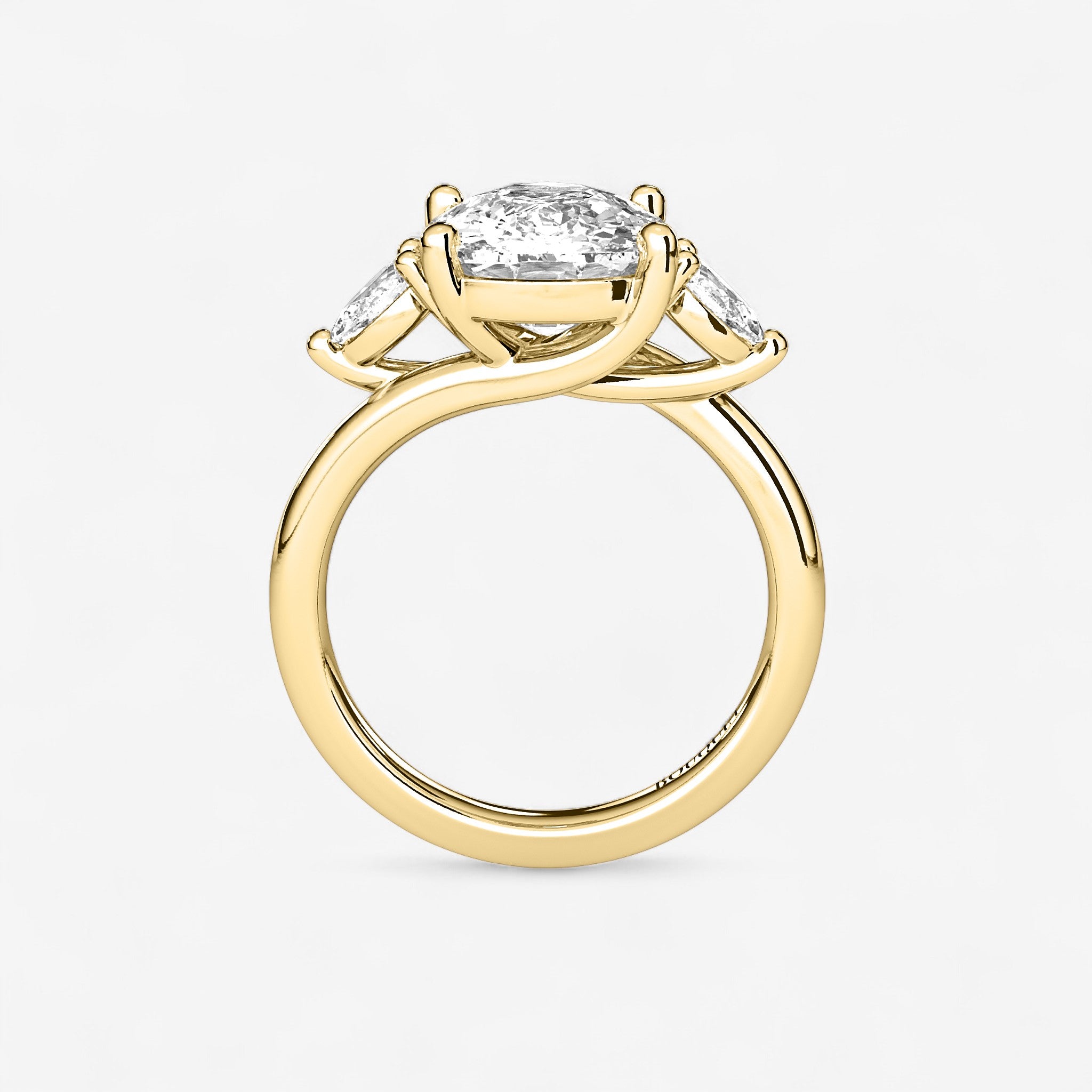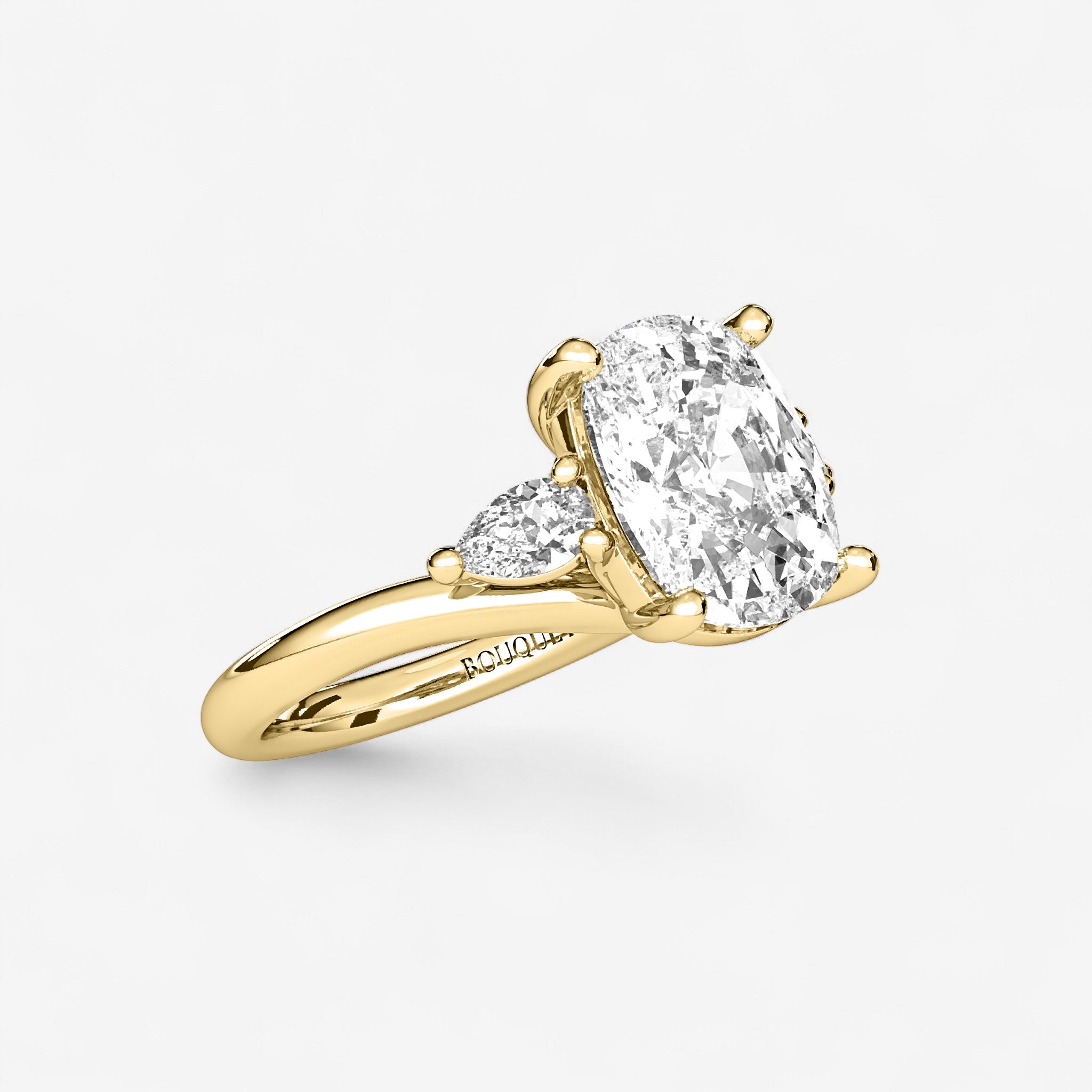 This exquisite three-stone engagement ring showcases a brilliant elongated cushion diamond as its focal point, complemented by two elegant pear-shaped stones nestled in a curved trellis setting. Featuring lab-grown diamonds throughout, this design combines modern luxury with classic sophistication, offering a distinctive silhouette that celebrates both brilliance and refined taste.