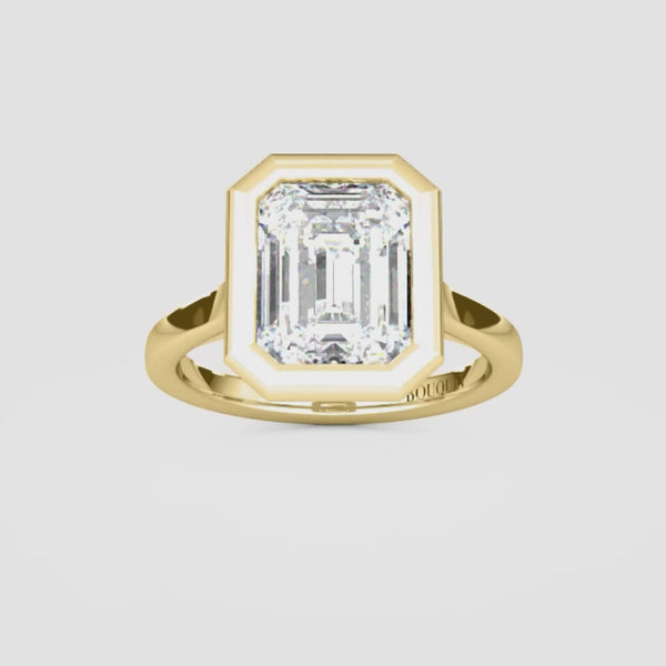 One our absolute favorite pieces in our collection and for good reason. Classic sophistication gets a modern twist in this refined round bezel set engagement ring. A lustrous emerald cut diamond is meticulously placed within an elegant bezel setting, optimally showcasing the gem's fire and play of light. Chic and durable, this ring offers the best of security and timeless luxury.