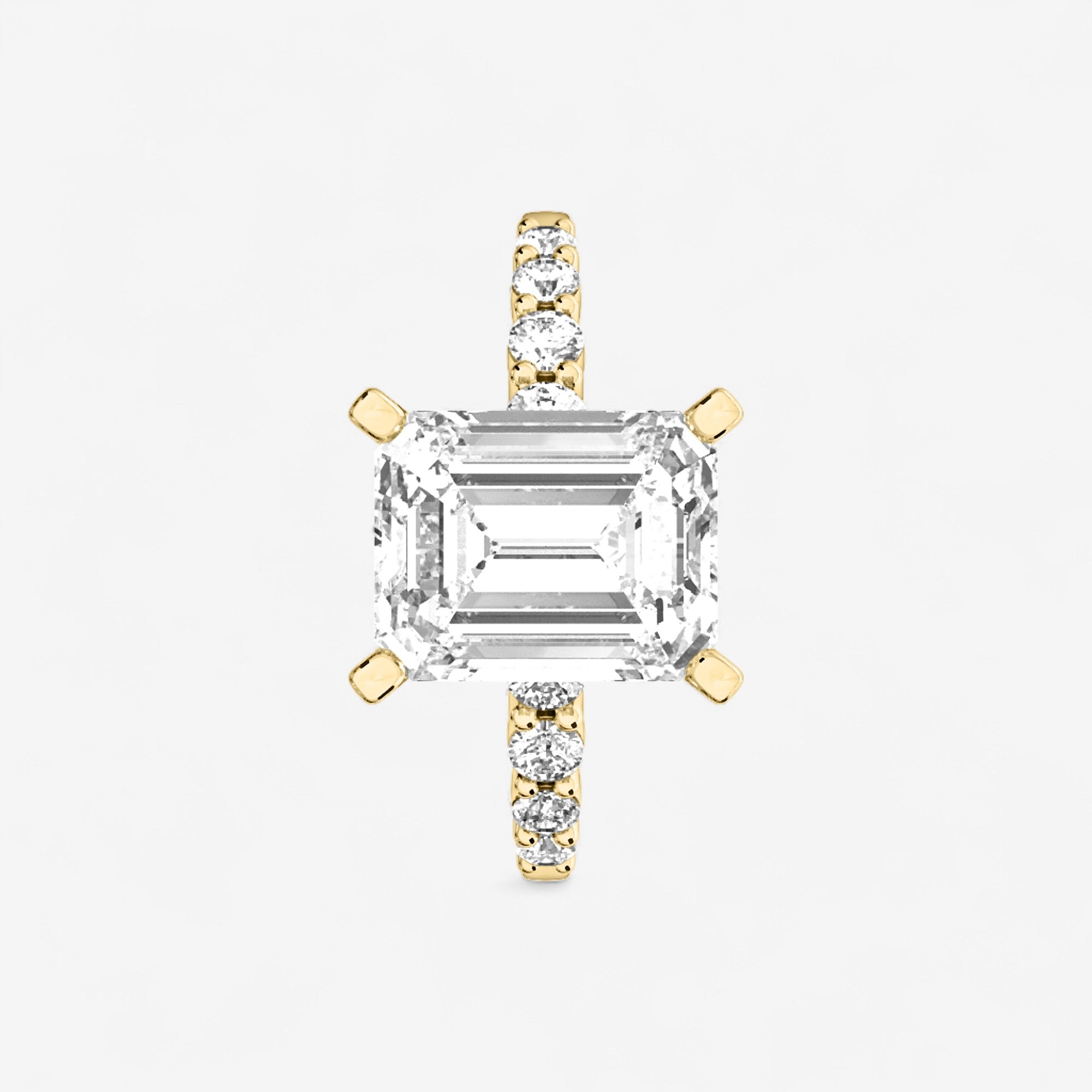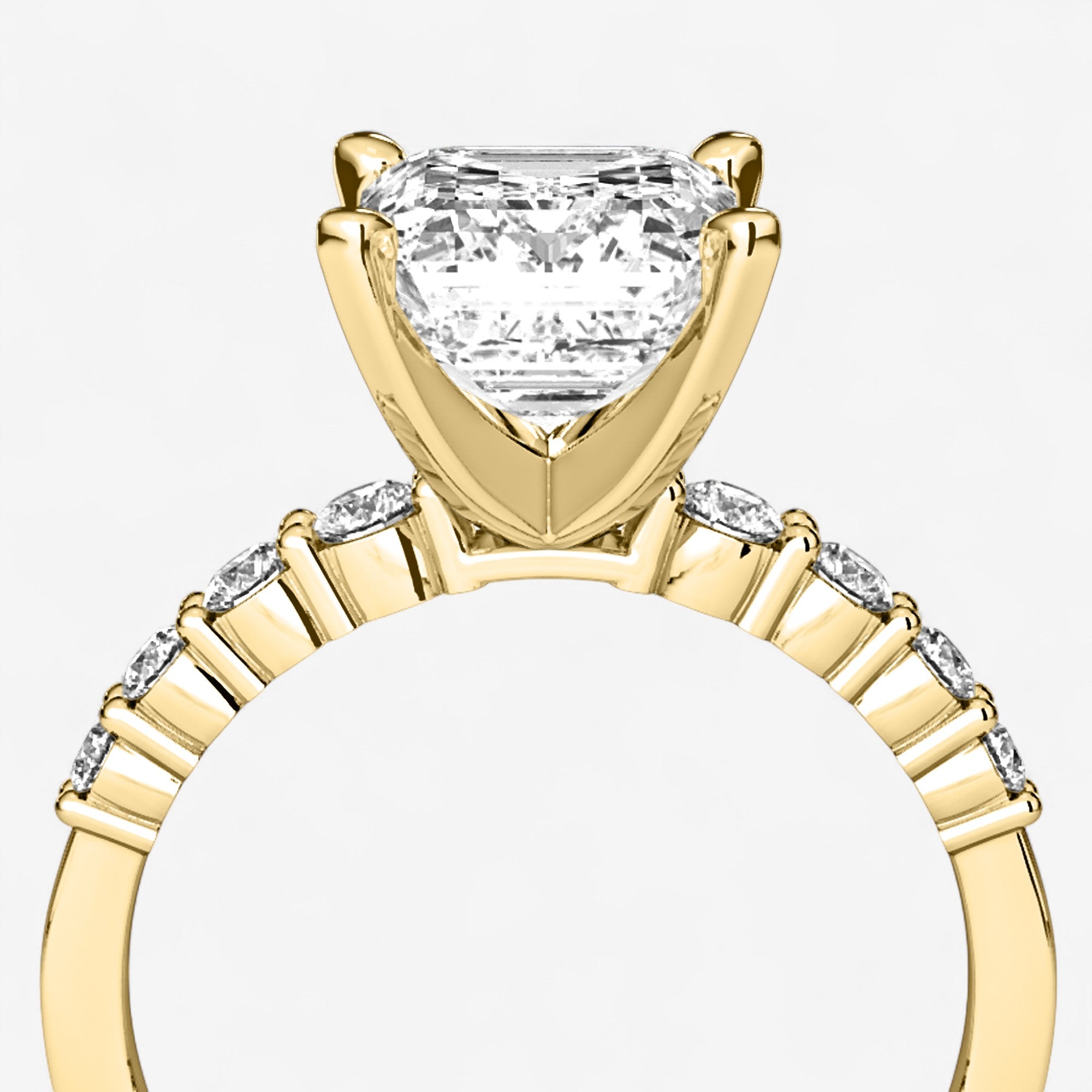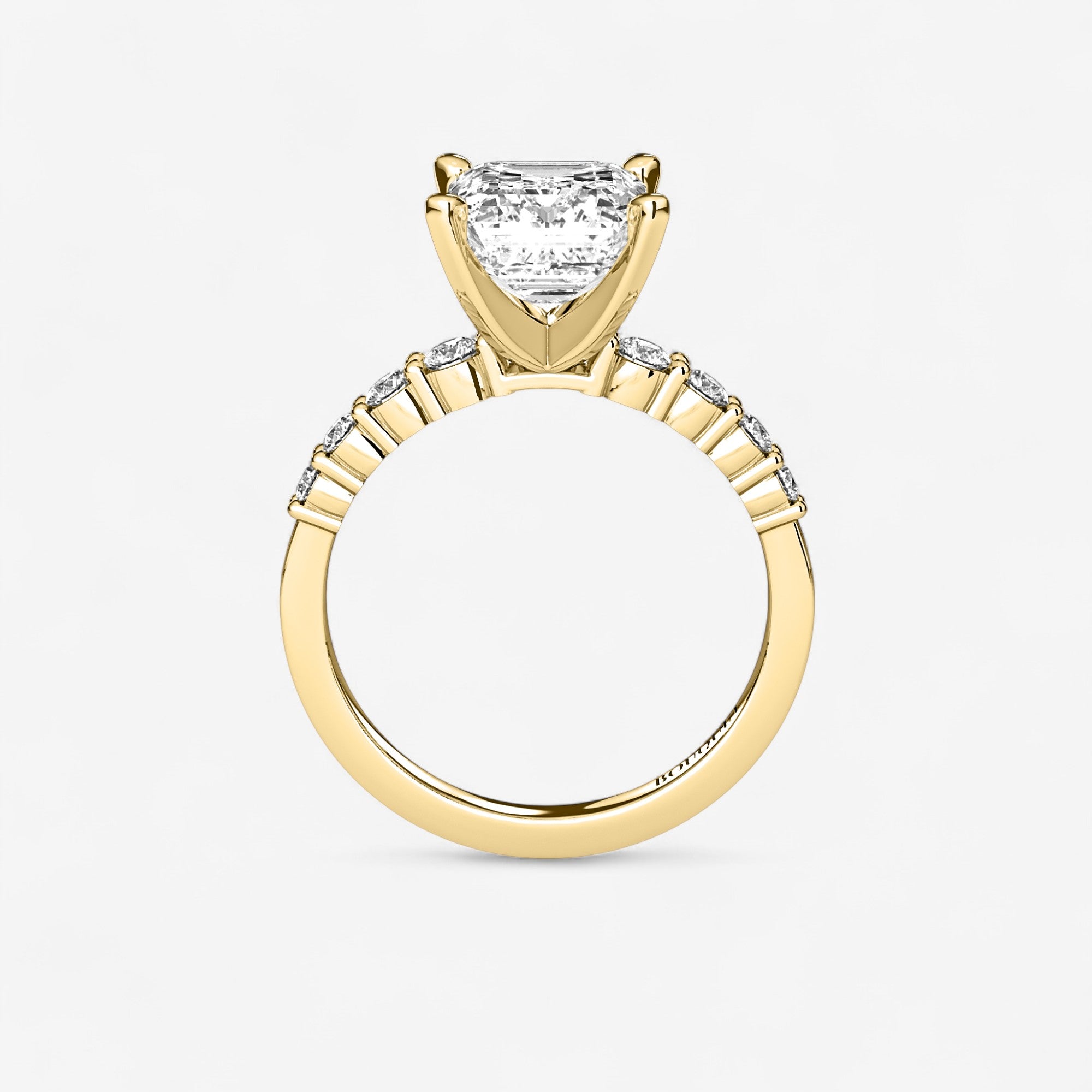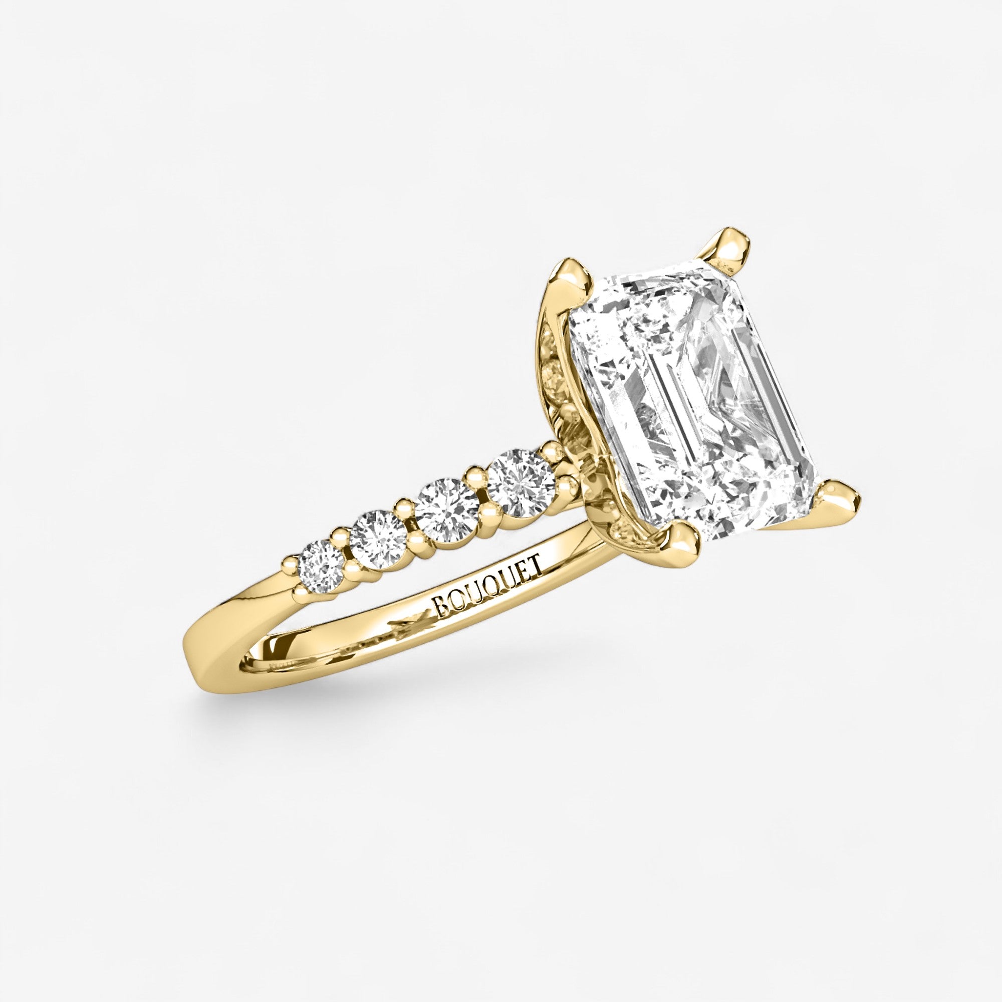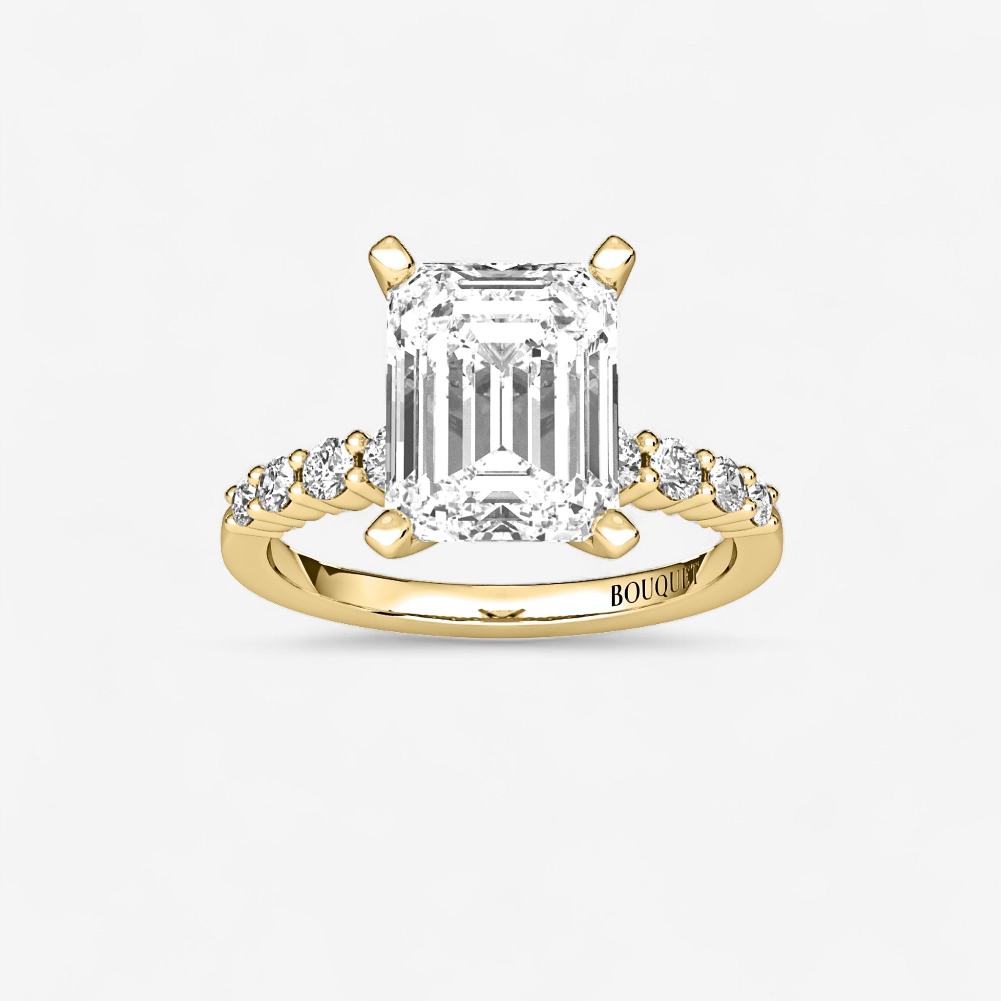 Meticulously crafted in gold or platinum, this elegant graduated side stone engagement ring embodies the perfect harmony of artistry and precision. The prong-set emeralds and round lab-grown diamonds impart a refined majesty to the design, while the distinctive emerald shapes convey timeless sophistication. This ring stands as a distinguished example of expert craftsmanship, transforming precious stones into a lasting emblem of love.
