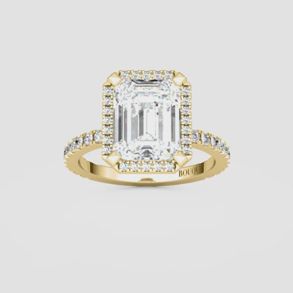 This exquisite emerald cut halo pave engagement ring features hidden diamond accents nestled in the prongs, enhancing its refined elegance. Side stones gracefully encircle nearly the entire band, ensuring brilliant sparkle from every angle. Designed to capture and reflect light flawlessly, it offers timeless sophistication for a truly captivating statement.
