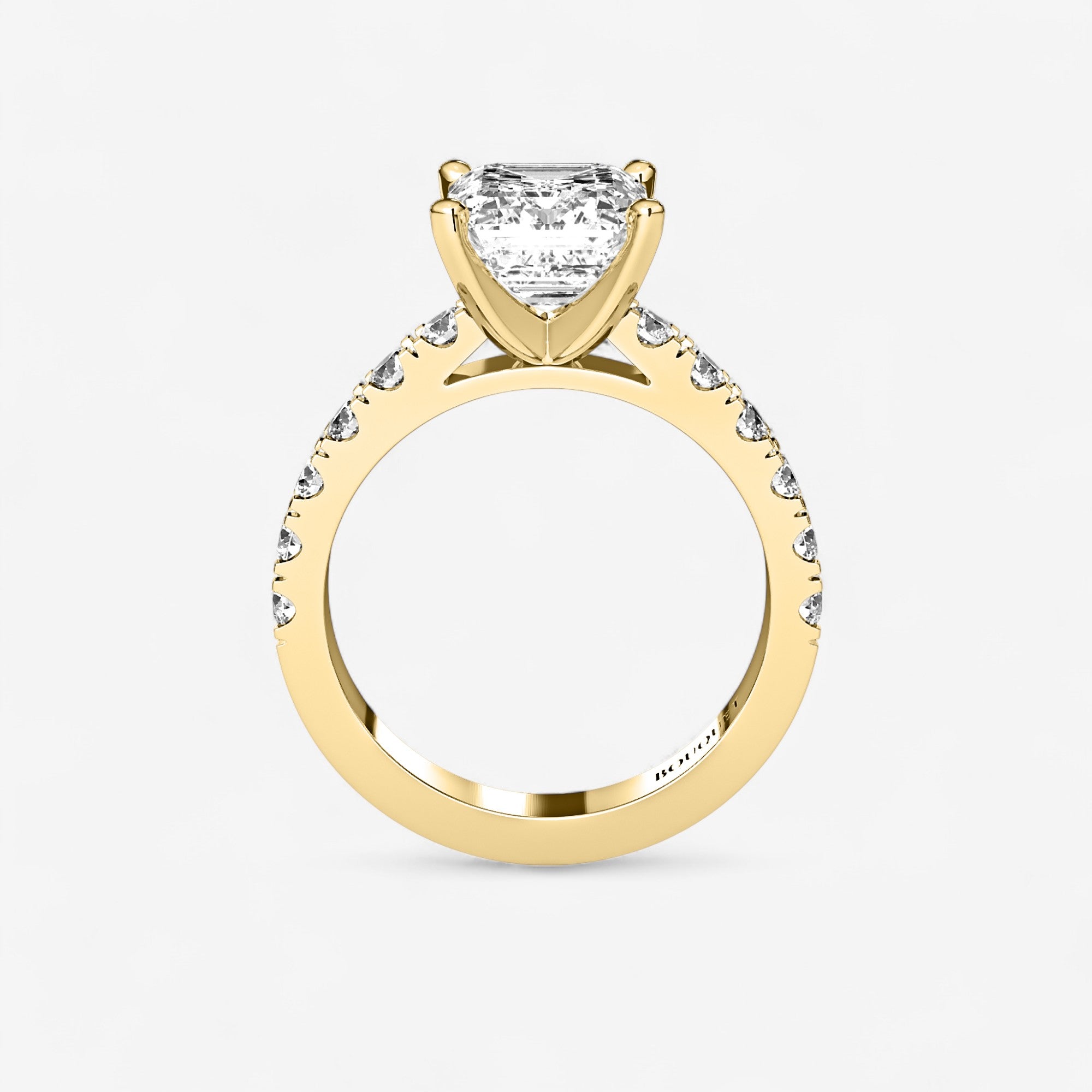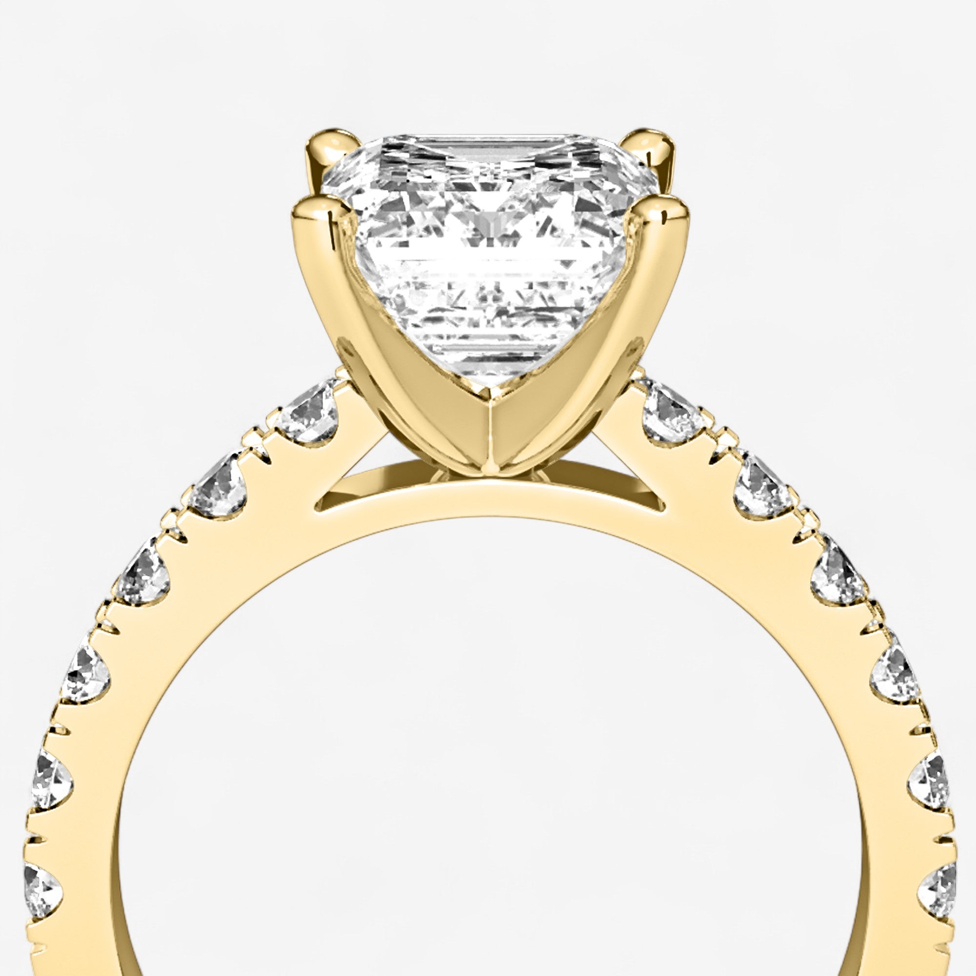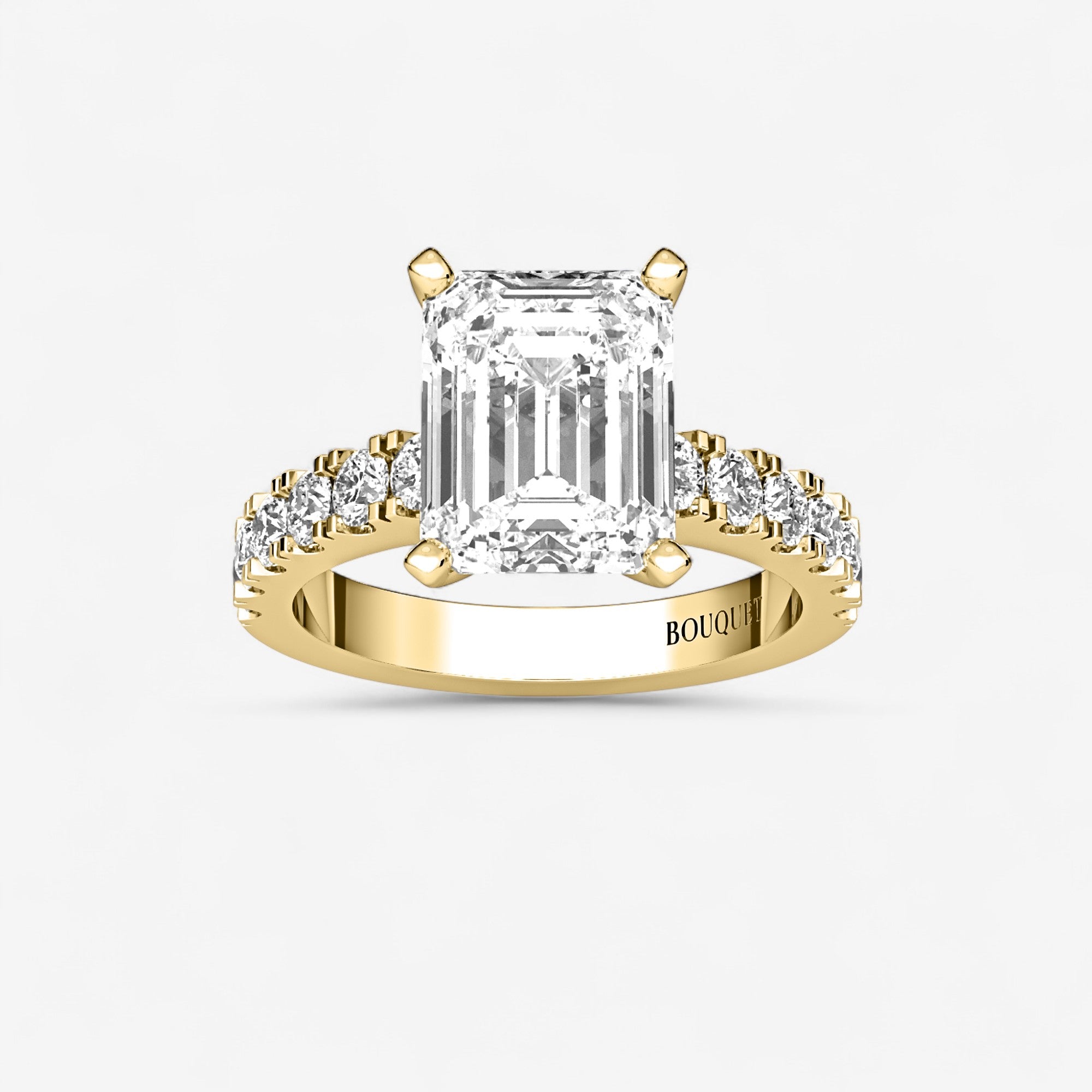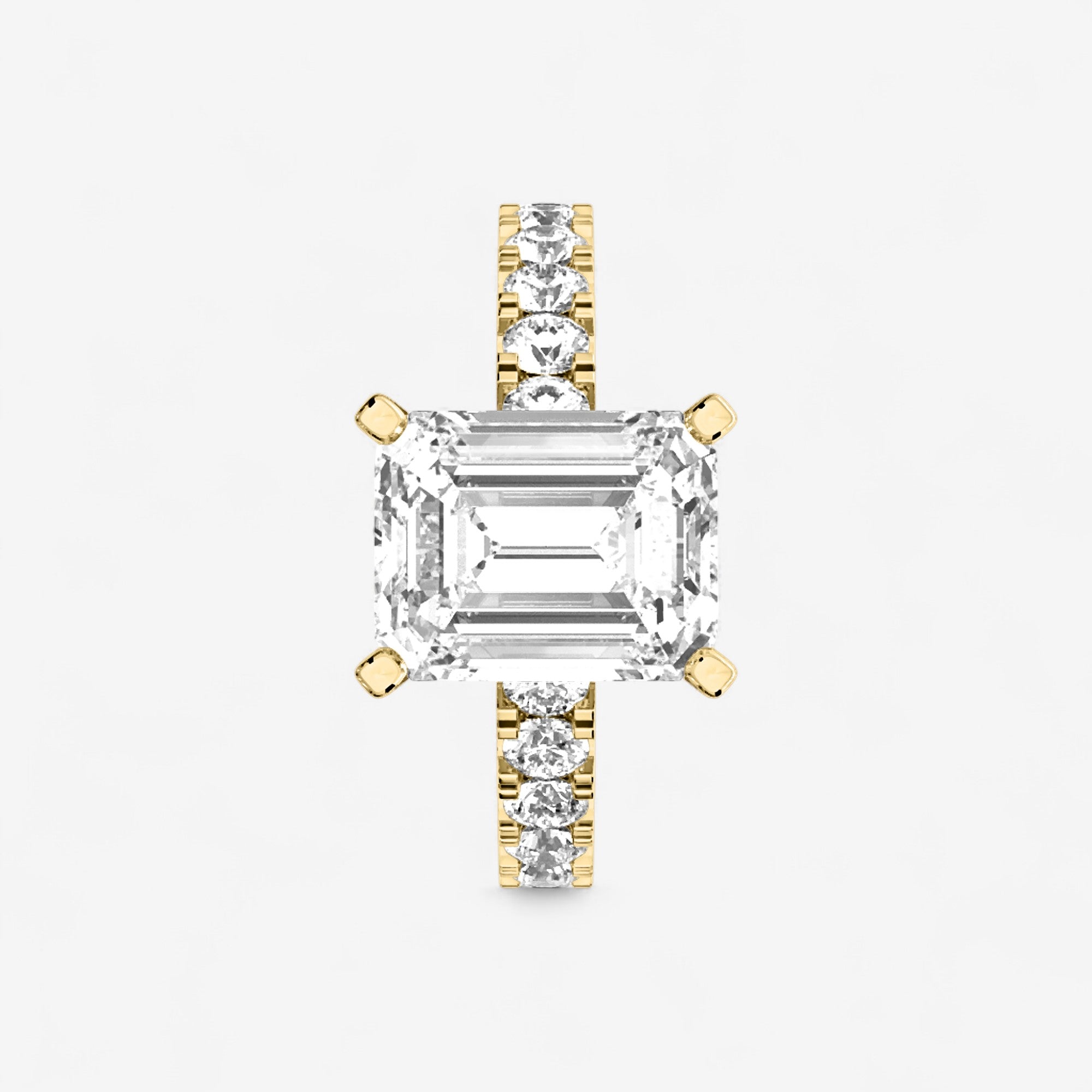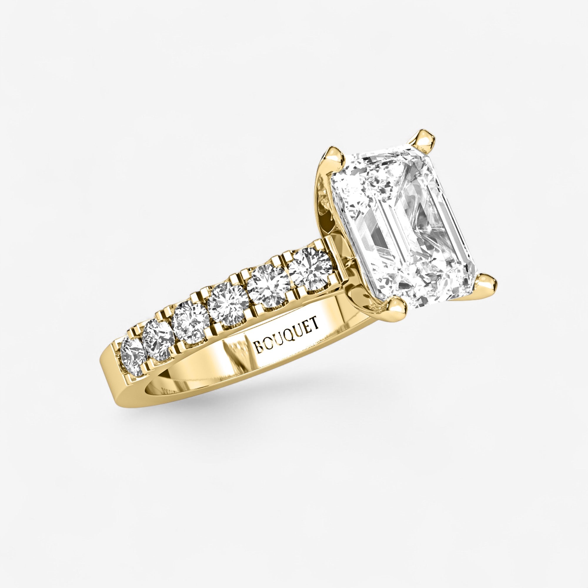 This exquisite engagement ring highlights a brilliant emerald cut center diamond set in classic gold or platinum, elevated by a row of sparkling side stones secured in a refined split prong setting. The split prongs allow for more light to enter each diamond, creating extra brilliance while giving the design a graceful, open look. Balancing timeless elegance with modern craftsmanship, this ring is a radiant expression of love designed to be cherished for a lifetime.