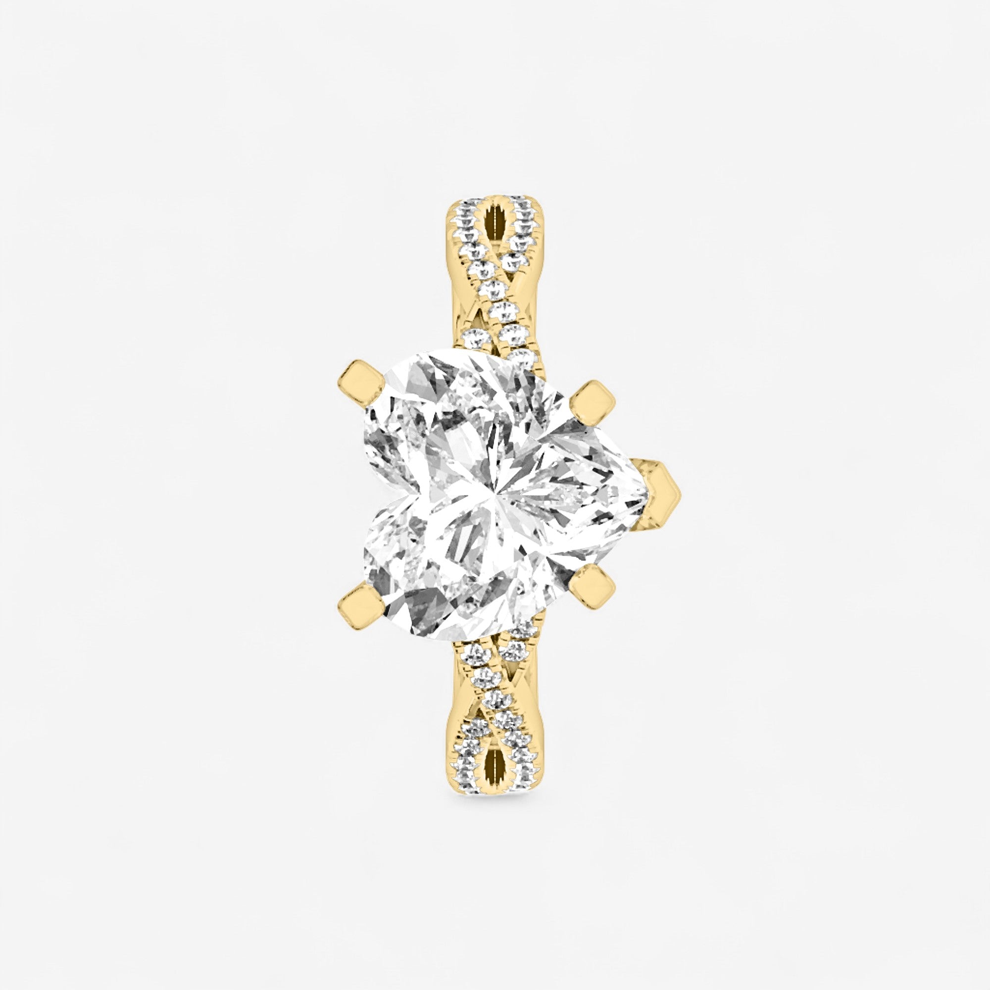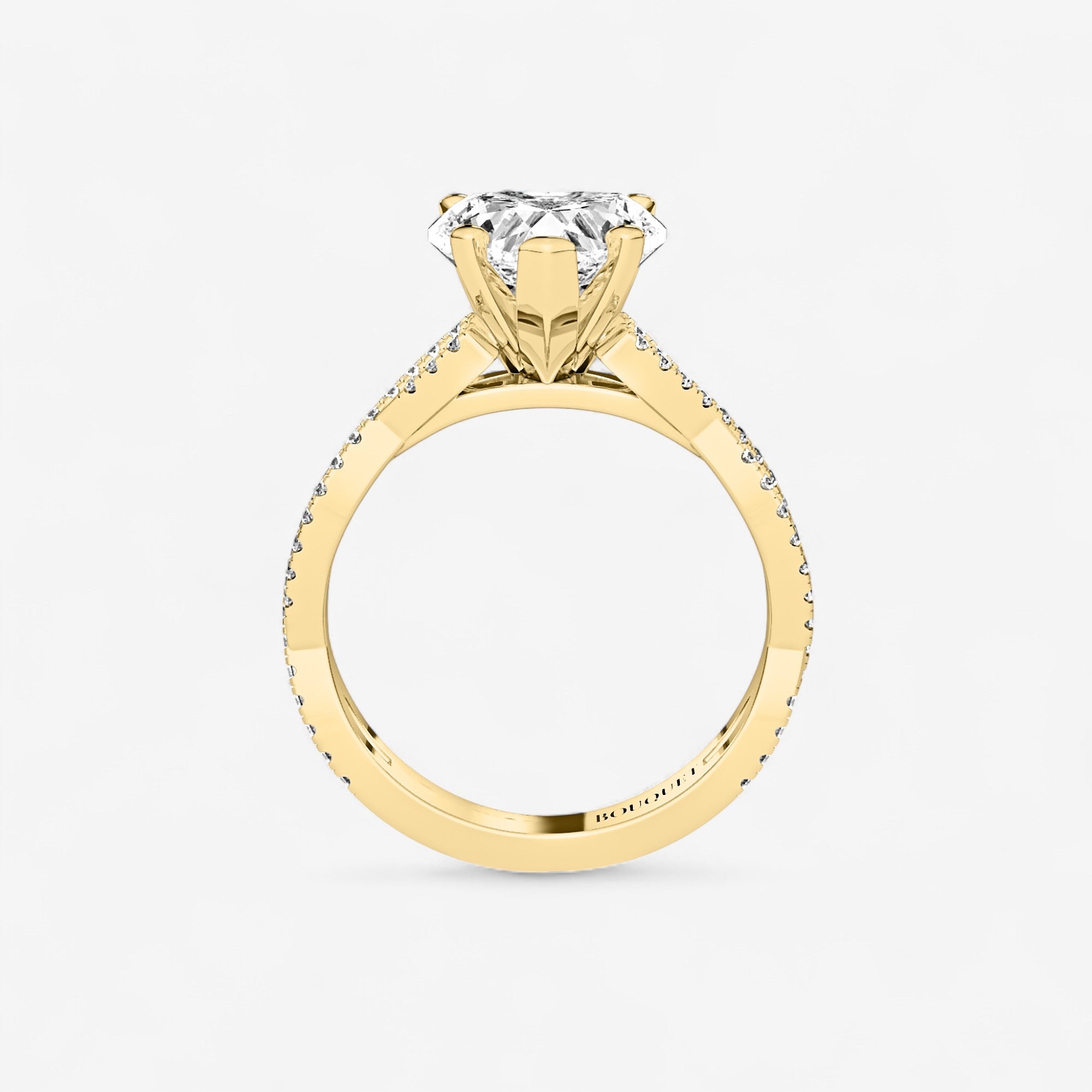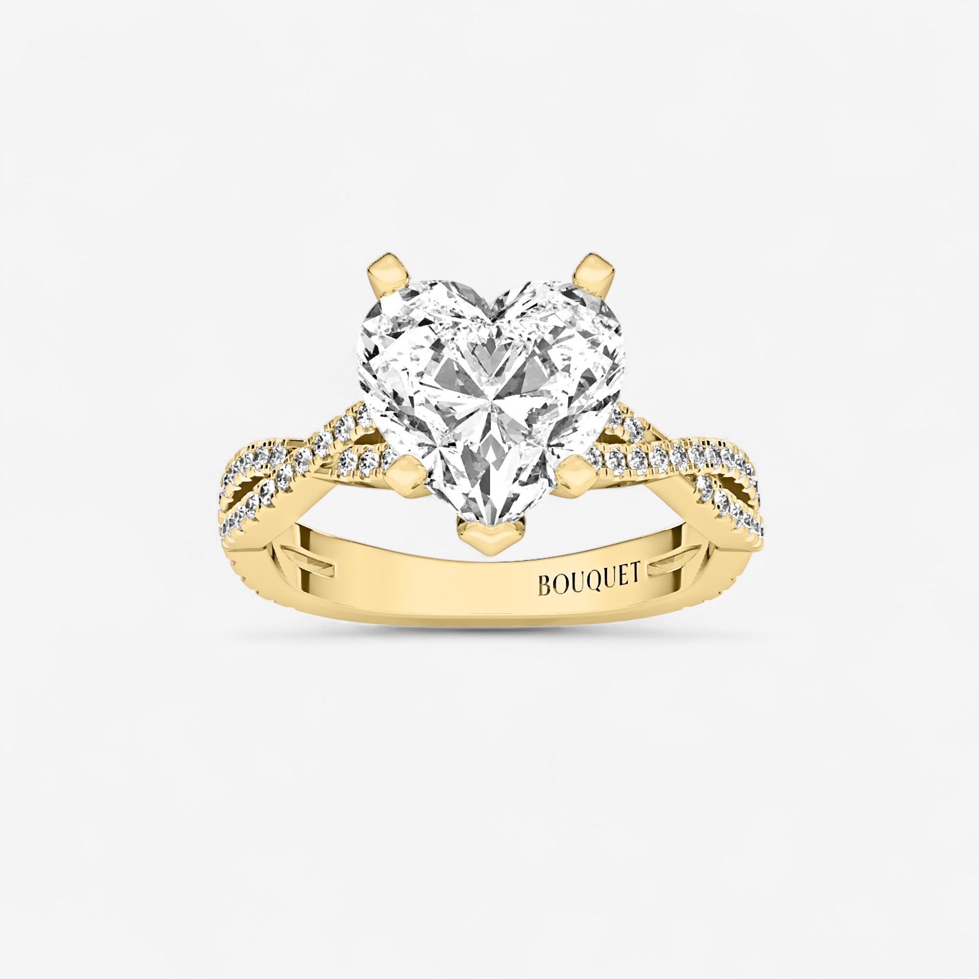 In a poetic interplay of curves and radiance, this 14K gold ring celebrates the union of a one of a kind heart diamond centerpiece with a double twist design adorned by shimmering round side stones. The prong setting accentuates each diamond's brilliance, creating a composition that exudes artistry and craftsmanship, perfect for symbolizing a love story as unique as your own.