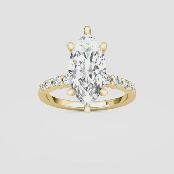This side stone engagement ring gracefully marries tradition and artistry, with an arrangement of marquise and round lab grown diamonds that cascade in a delicate graduated design. Set in lustrous gold or platinum, its prong setting lends a timeless allure, allowing the diamonds to catch the light with every movement. The ring's masterful craftsmanship ensures it becomes a cherished emblem of love and an enduring symbol of devotion.