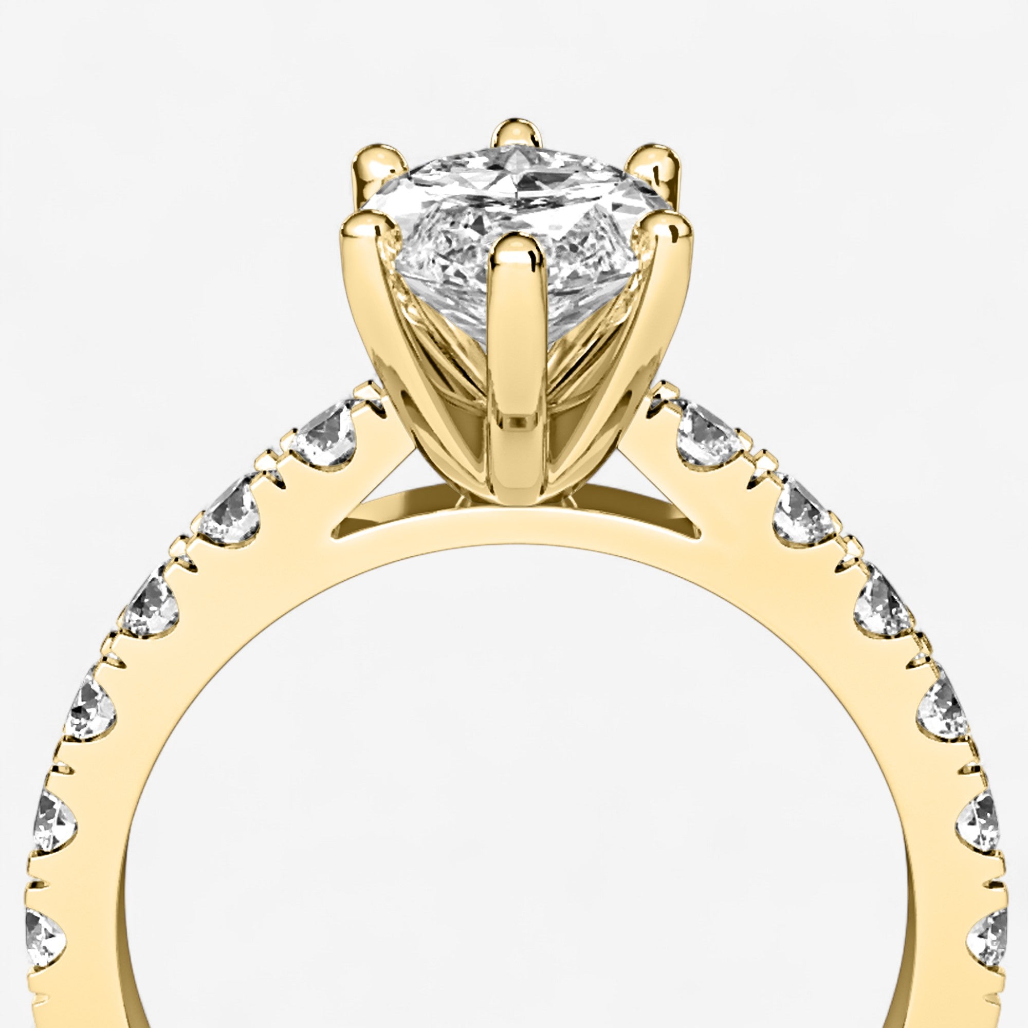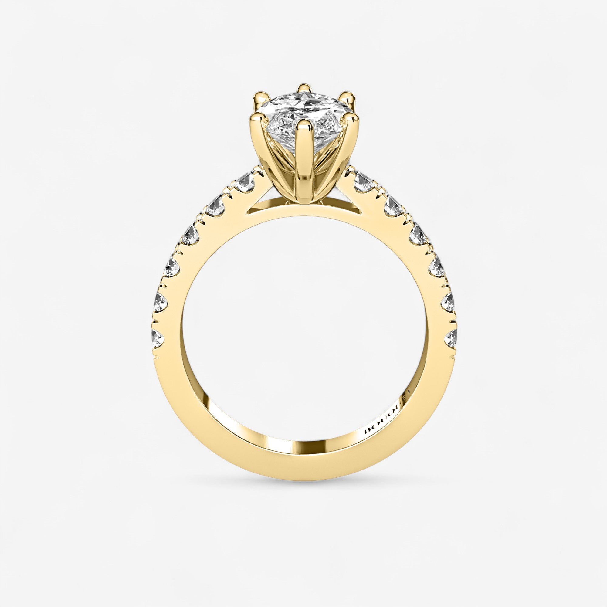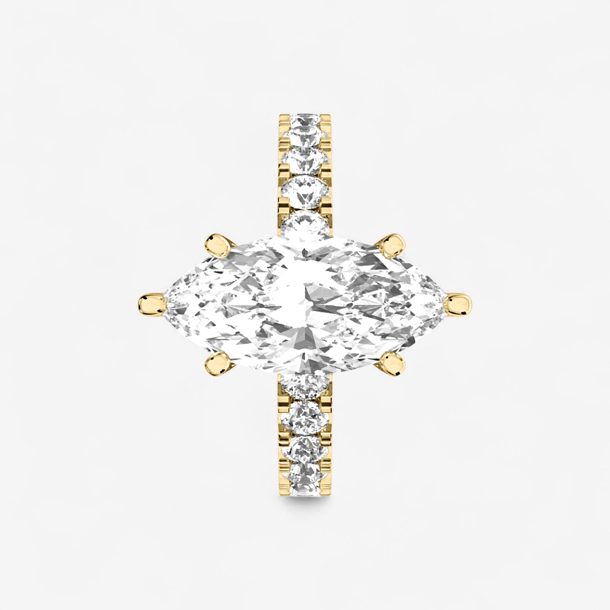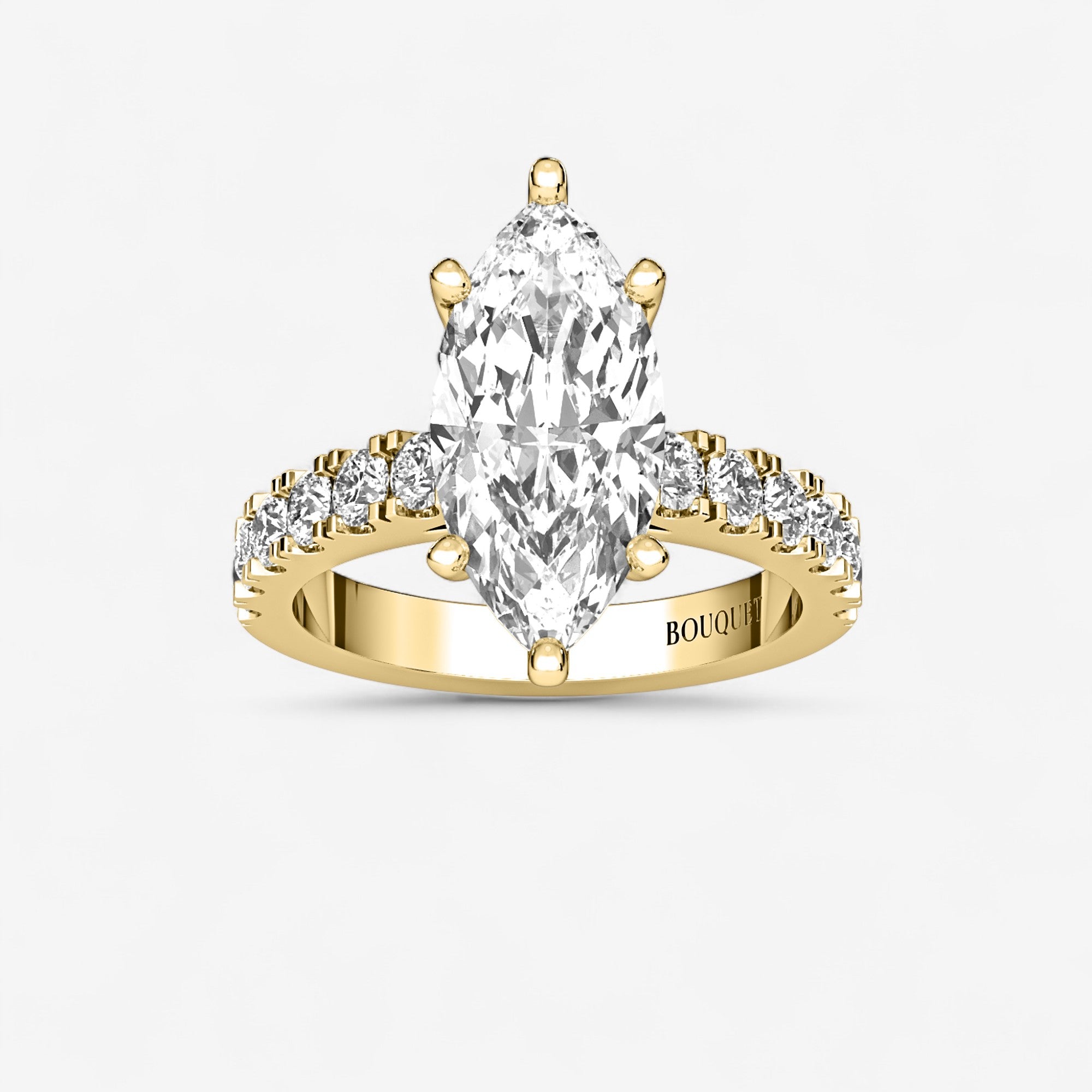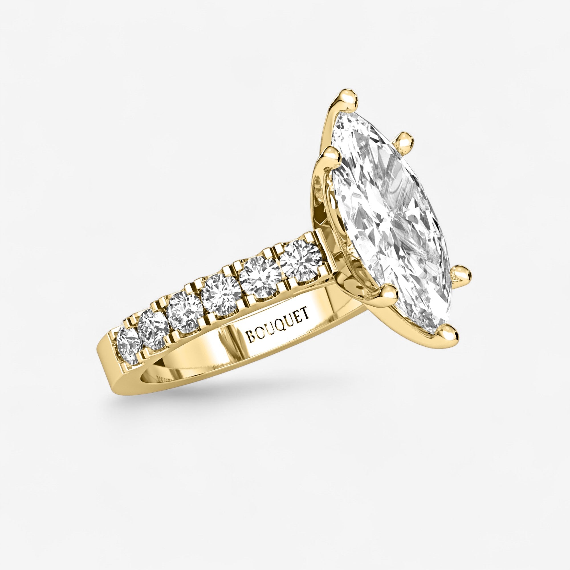 This exquisite engagement ring highlights a brilliant marquise center diamond set in classic gold or platinum, elevated by a row of sparkling side stones secured in a refined split prong setting. The split prongs allow for more light to enter each diamond, creating extra brilliance while giving the design a graceful, open look. Balancing timeless elegance with modern craftsmanship, this ring is a radiant expression of love designed to be cherished for a lifetime.