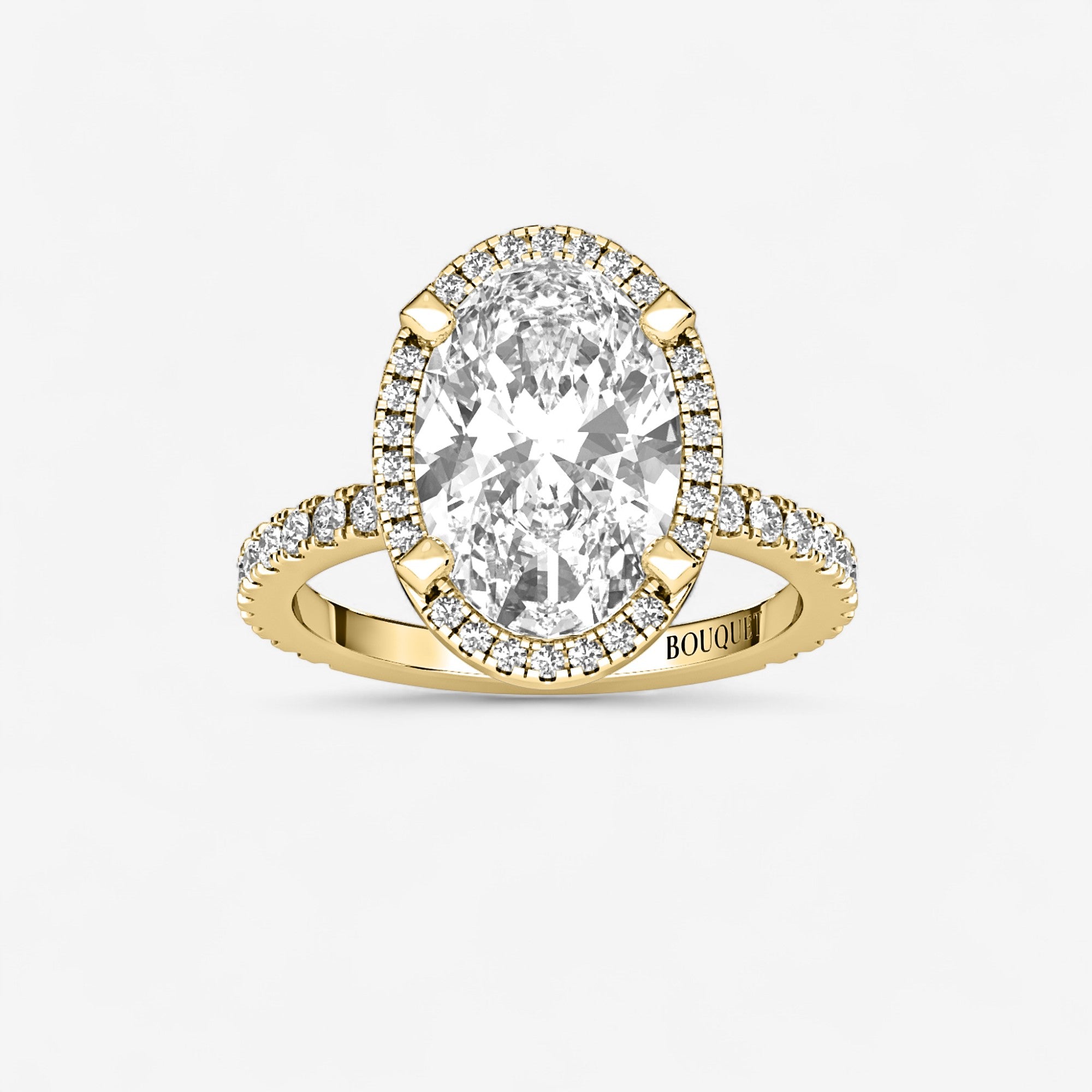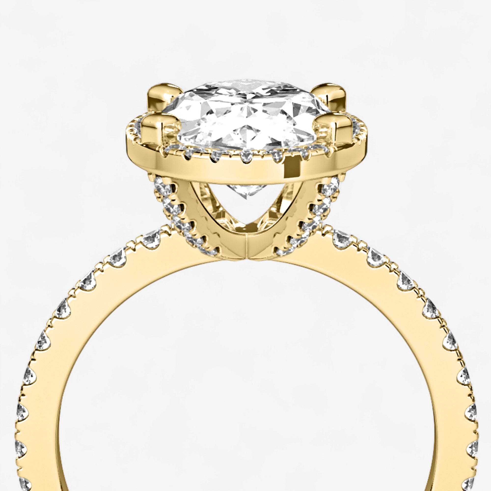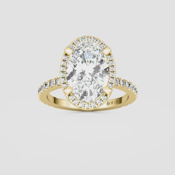 This exquisite oval halo pave engagement ring features hidden diamond accents nestled in the prongs, enhancing its refined elegance. Side stones gracefully encircle nearly the entire band, ensuring brilliant sparkle from every angle. Designed to capture and reflect light flawlessly, it offers timeless sophistication for a truly captivating statement.