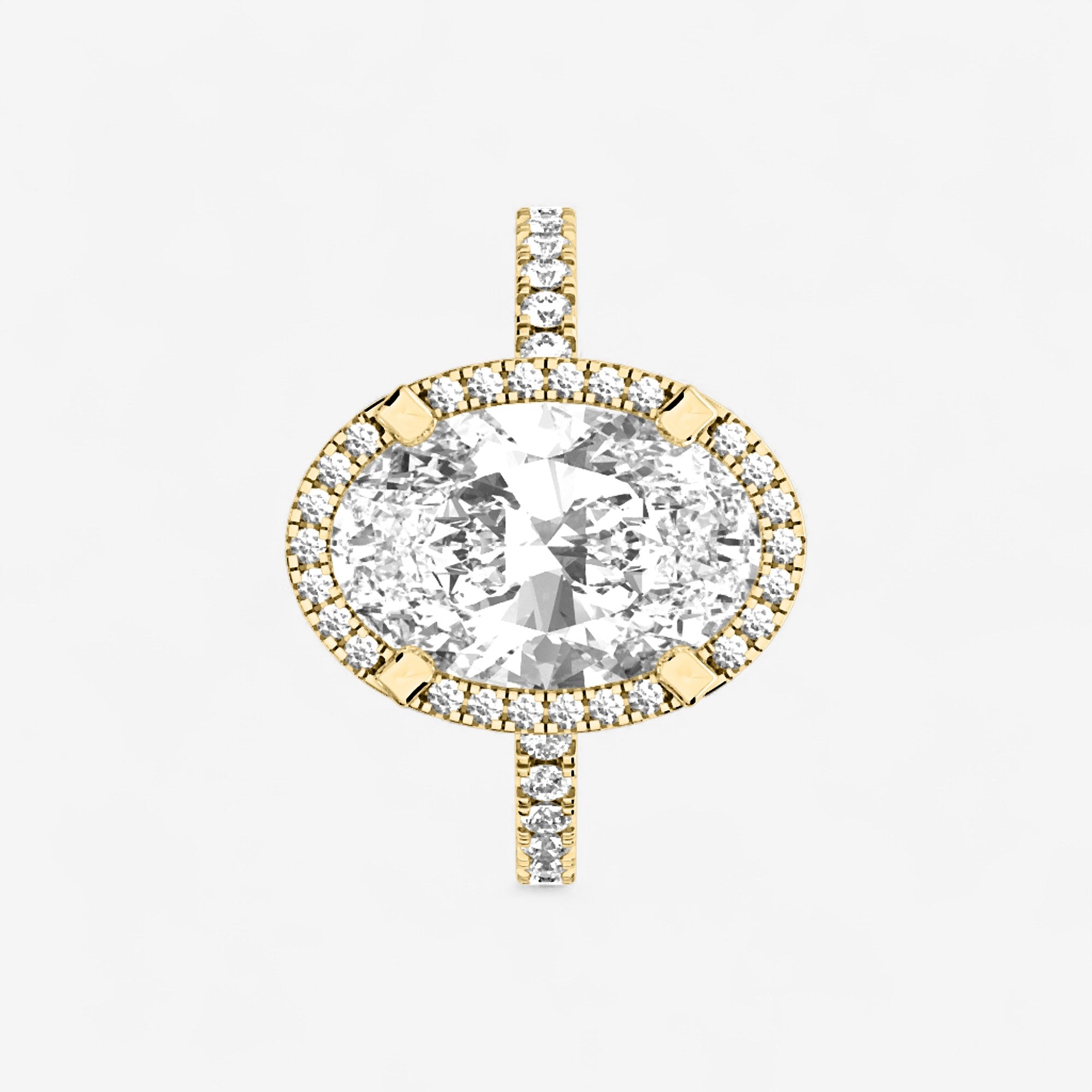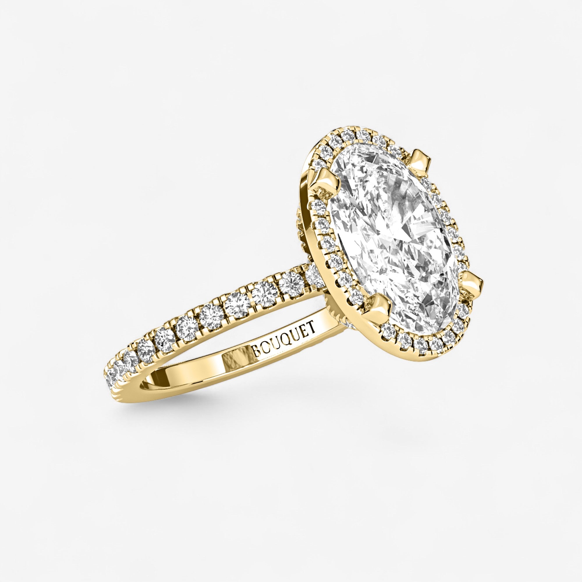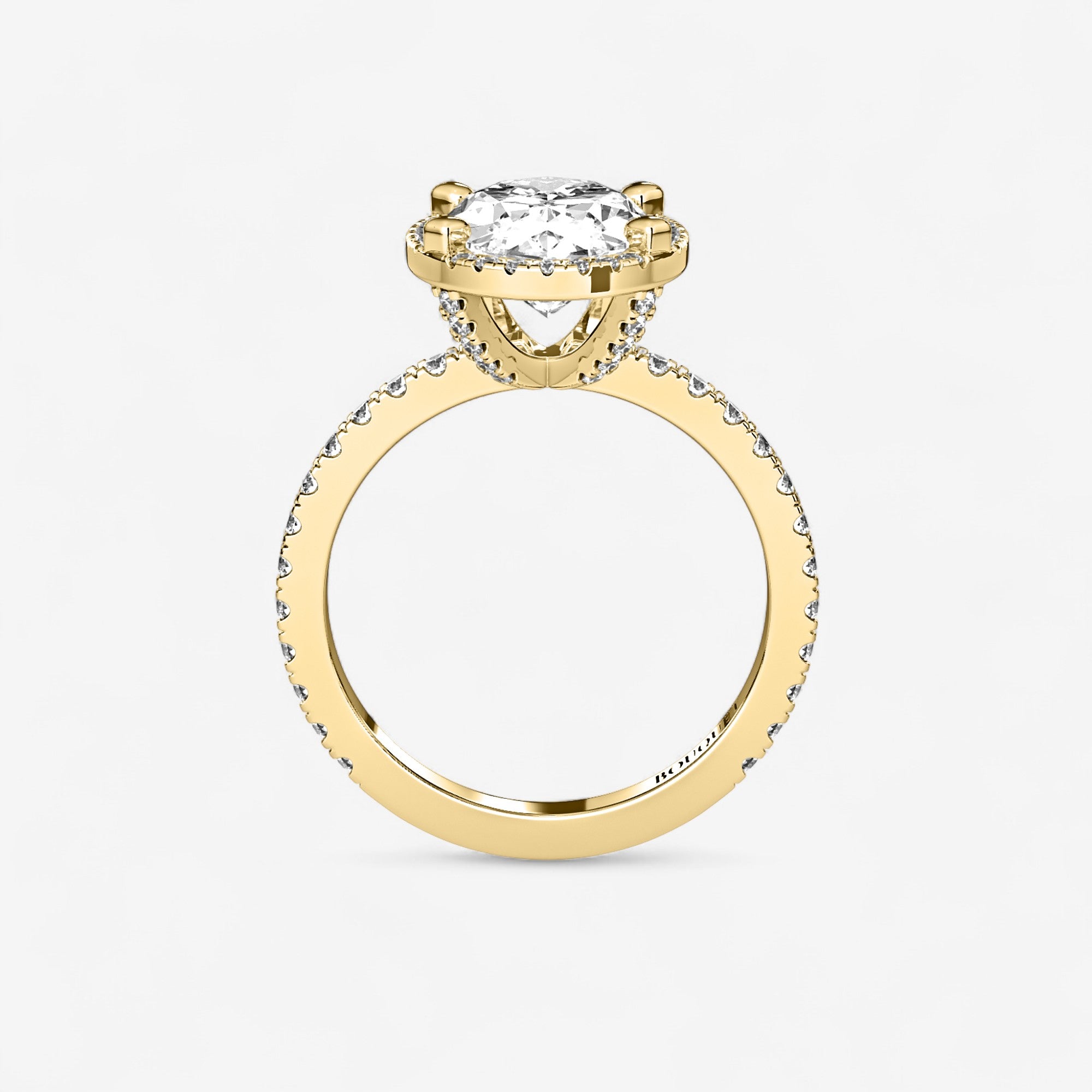 This exquisite oval halo pave engagement ring features hidden diamond accents nestled in the prongs, enhancing its refined elegance. Side stones gracefully encircle nearly the entire band, ensuring brilliant sparkle from every angle. Designed to capture and reflect light flawlessly, it offers timeless sophistication for a truly captivating statement.