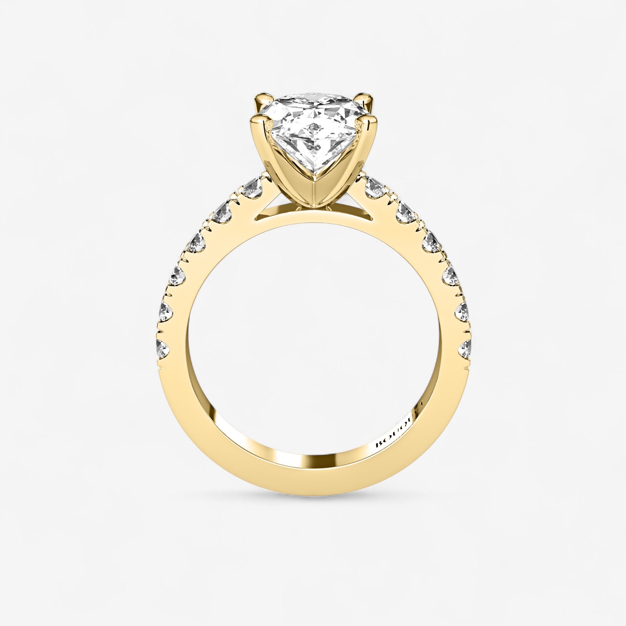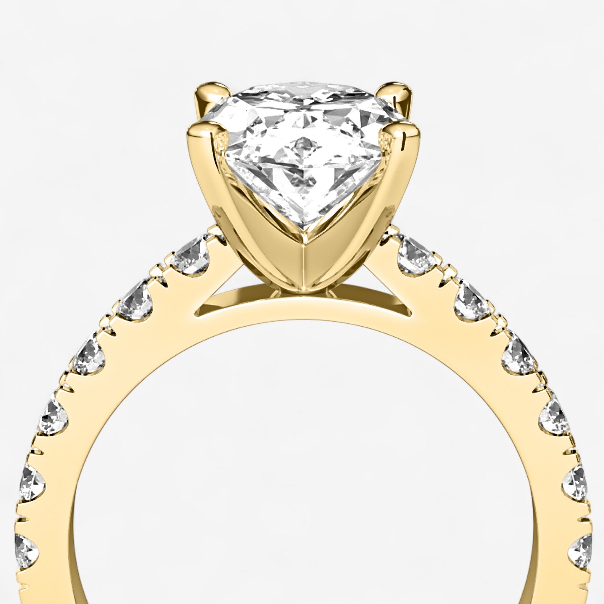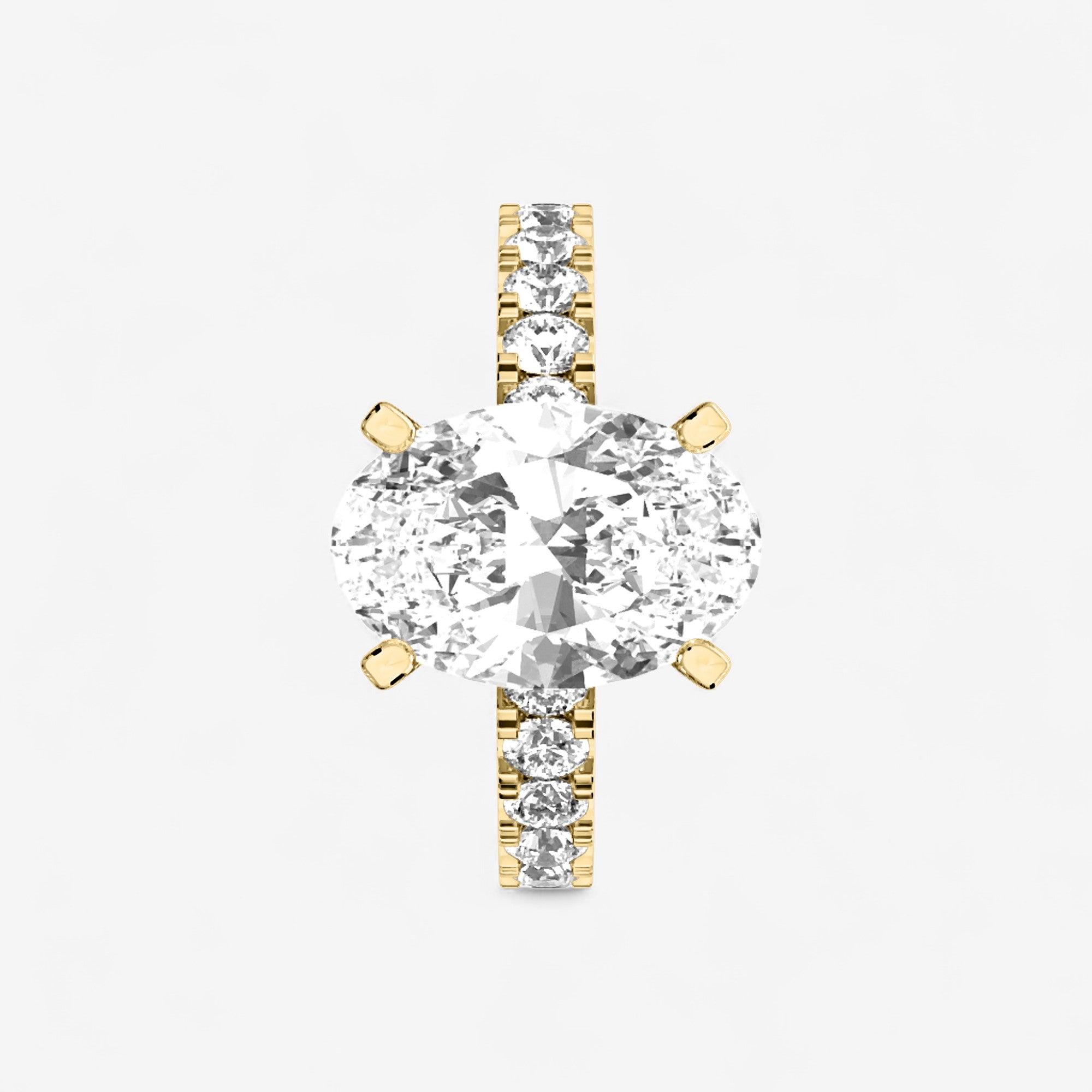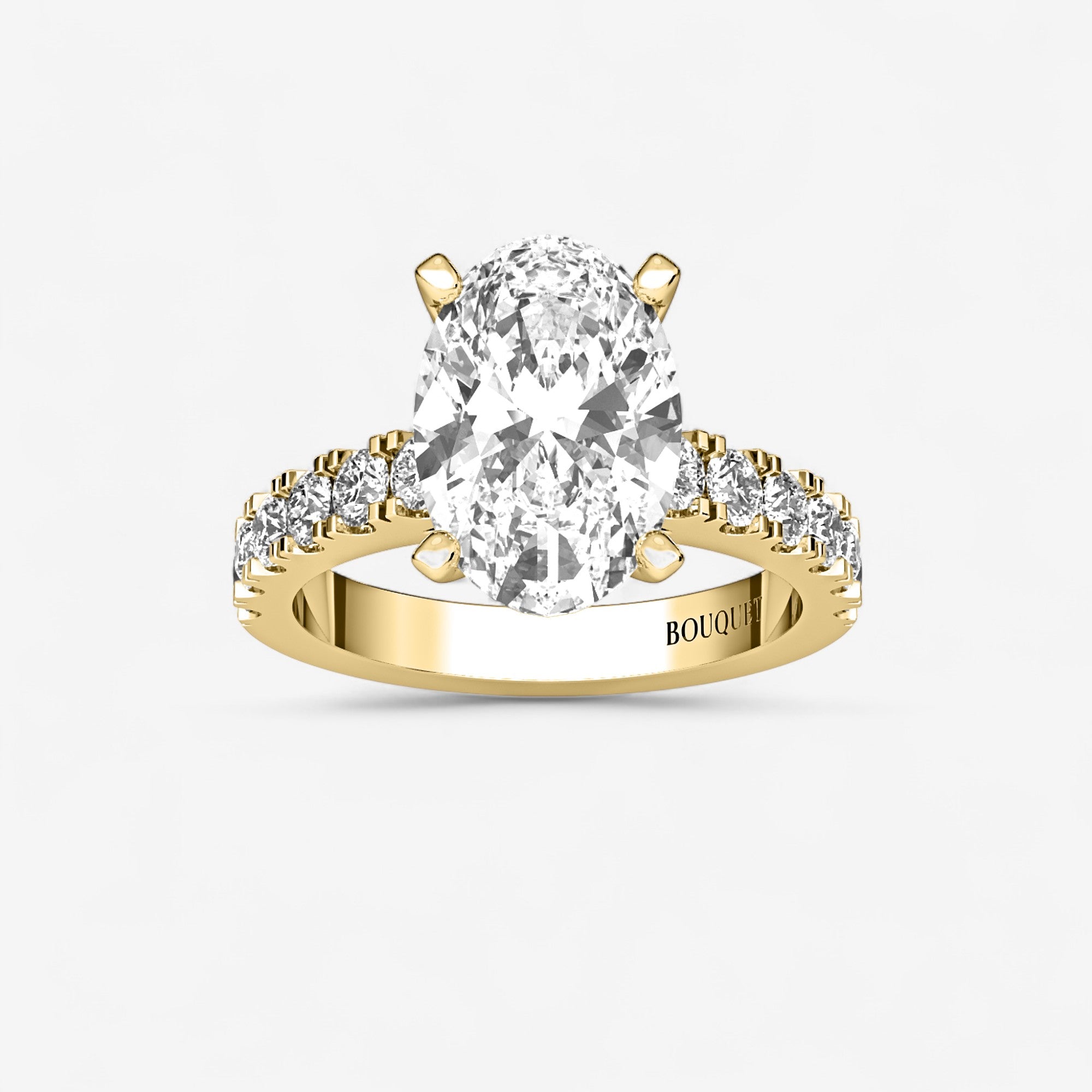 This exquisite engagement ring highlights a brilliant oval center diamond set in classic gold or platinum, elevated by a row of sparkling side stones secured in a refined split prong setting. The split prongs allow for more light to enter each diamond, creating extra brilliance while giving the design a graceful, open look. Balancing timeless elegance with modern craftsmanship, this ring is a radiant expression of love designed to be cherished for a lifetime.