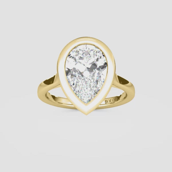 One our absolute favorite pieces in our collection and for good reason. Classic sophistication gets a modern twist in this refined round bezel set engagement ring. A lustrous pear diamond is meticulously placed within an elegant bezel setting, optimally showcasing the gem's fire and play of light. Chic and durable, this ring offers the best of security and timeless luxury.