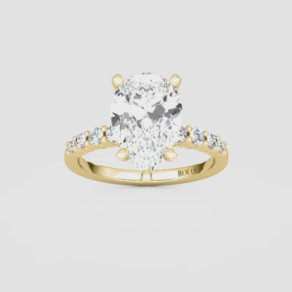 In this enchanting engagement ring, each element sings in harmony, a beautiful arrangement of lab grown diamonds is carefully set in 14K gold or platinum to evoke a sense of grace. The graduated design pairs pear and round diamonds in a prong setting, perfectly drawing the eye to its artistry. A piece that feels as unique and profound as the love it represents.