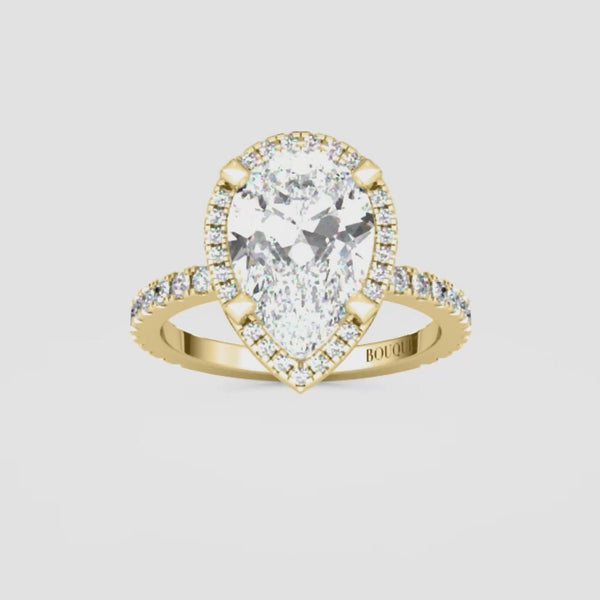 This exquisite pear shape halo pave engagement ring features hidden diamond accents nestled in the prongs, enhancing its refined elegance. Side stones gracefully encircle nearly the entire band, ensuring brilliant sparkle from every angle. Designed to capture and reflect light flawlessly, it offers timeless sophistication for a truly captivating statement.