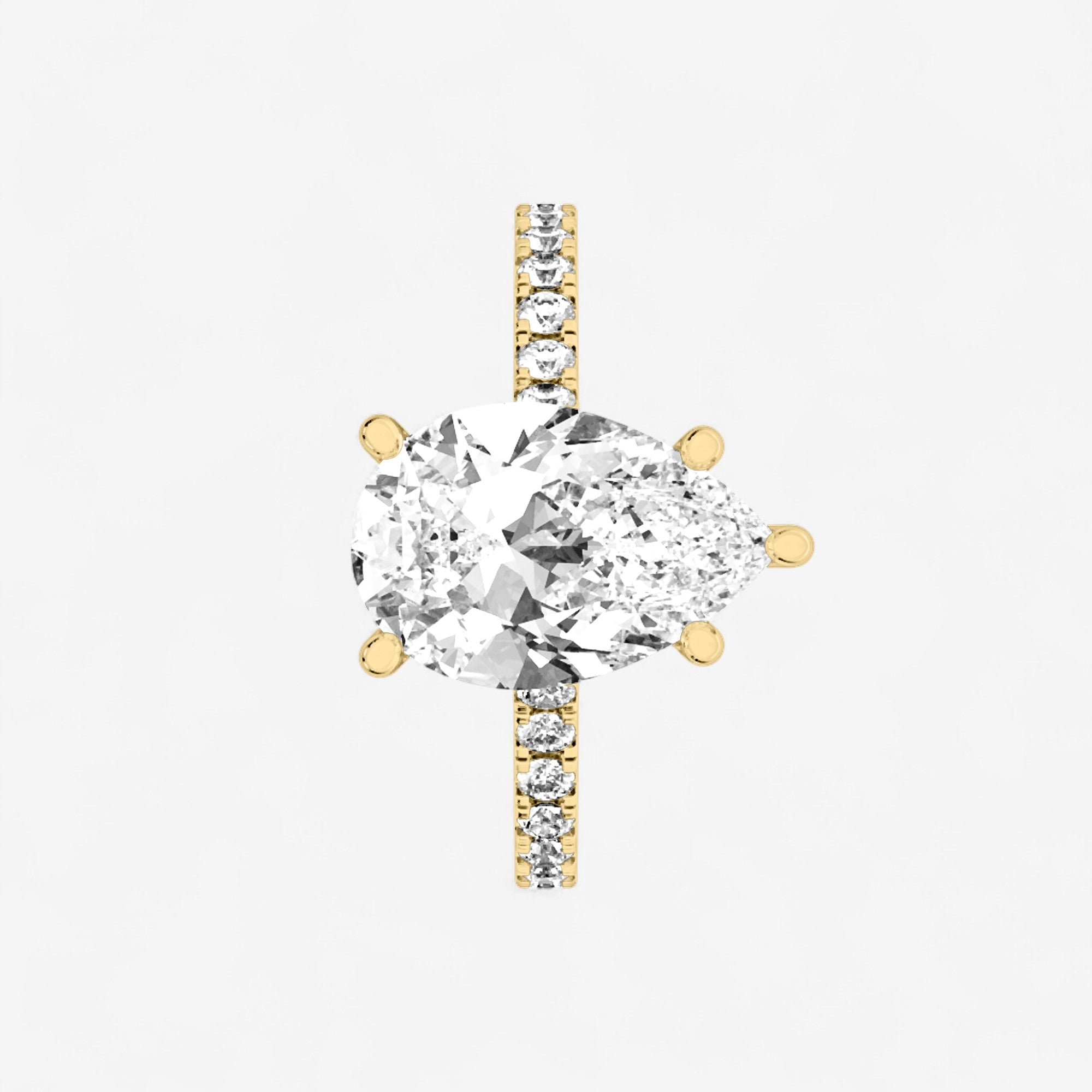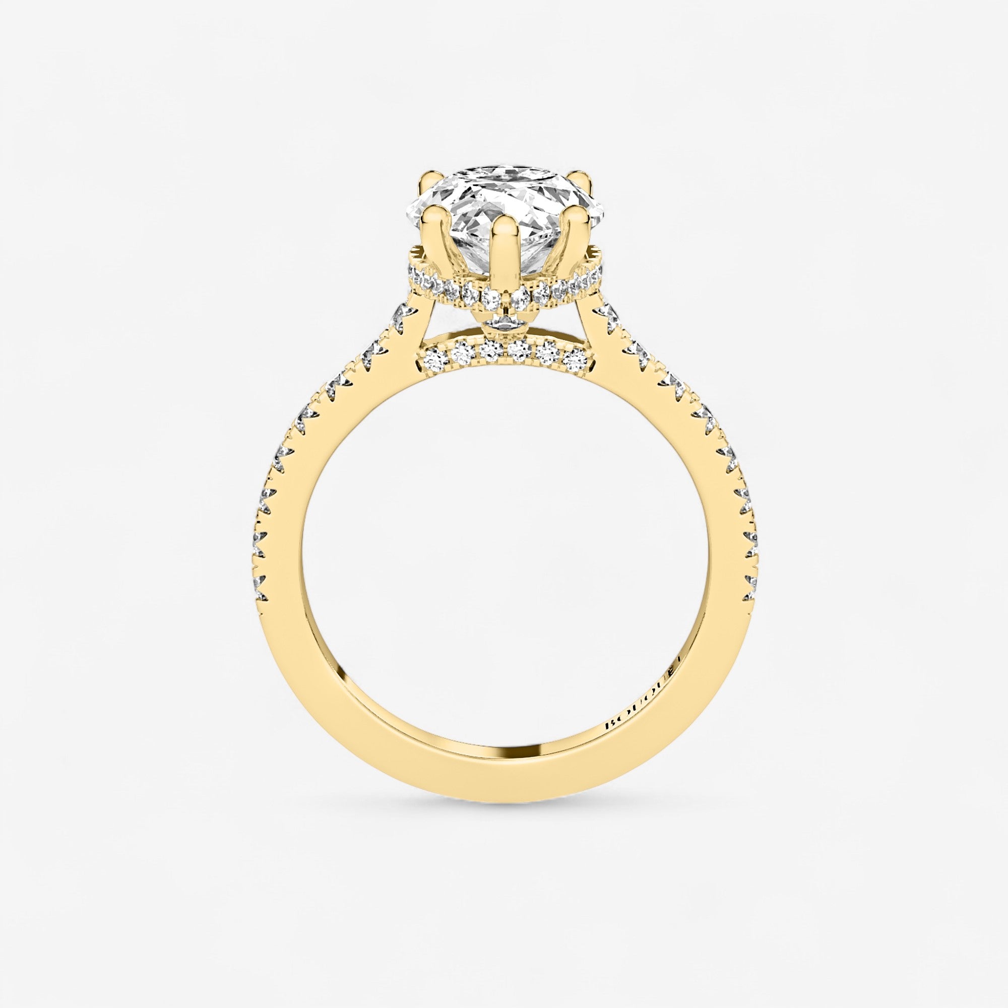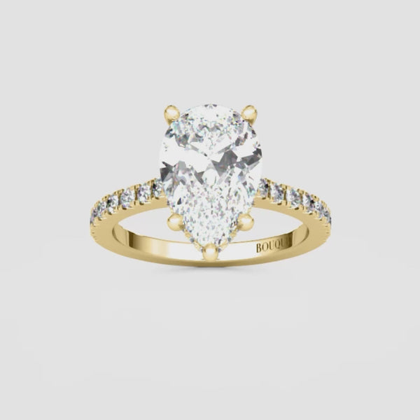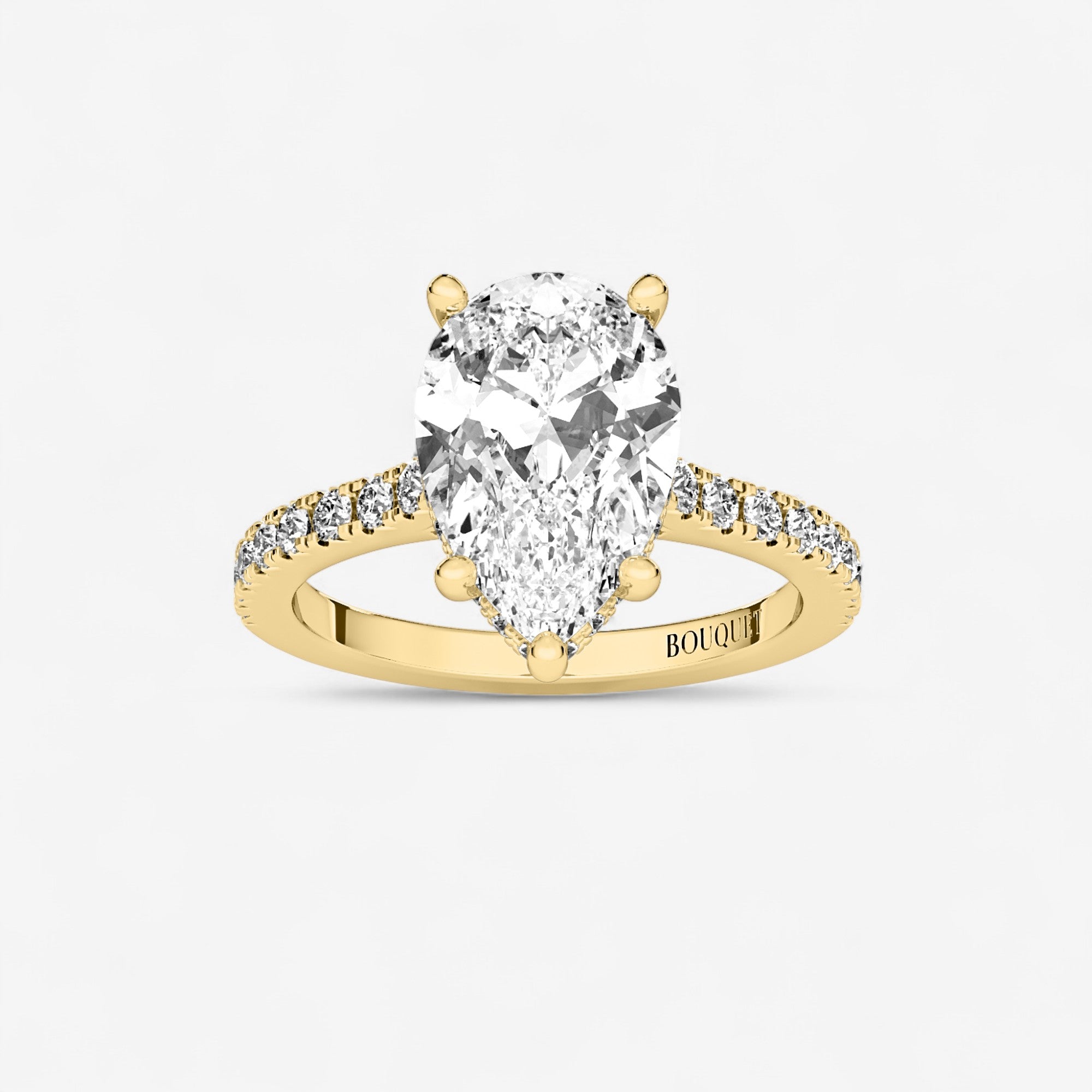 Presenting our Hidden Halo Pear Cut Pave Engagement Ring, where refined elegance meets radiant brilliance. Expertly crafted as a lasting symbol of devotion, this exquisite piece showcases a stunning pear center stone encircled by a delicate halo of sparkling lab-grown diamonds. The pave-set side stones and additional accent diamonds beneath the ring’s head add depth and sparkle, enhancing its timeless beauty. Honor your love story with the understated sophistication and grace of this exceptional engagement ring.