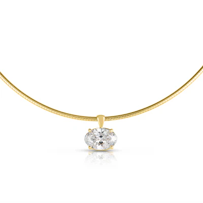 Suspended from a lustrous omega chain, this solitaire pendant captures the quiet allure of a single oval lab grown diamond. Held securely in a prong setting, the gem is complemented by the warm glow of 14K gold, creating a piece that embodies simplicity and grace. Its seamless design reflects impeccable craftsmanship, ensuring it is as enduring as it is striking.