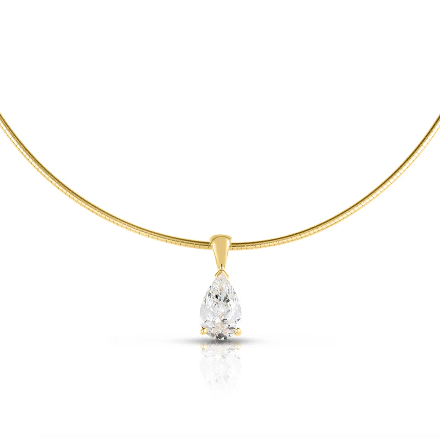 Suspended from a lustrous omega chain, this solitaire pendant captures the quiet allure of a single pear lab grown diamond. Held securely in a prong setting, the gem is complemented by the warm glow of 14K gold, creating a piece that embodies simplicity and grace. Its seamless design reflects impeccable craftsmanship, ensuring it is as enduring as it is striking.