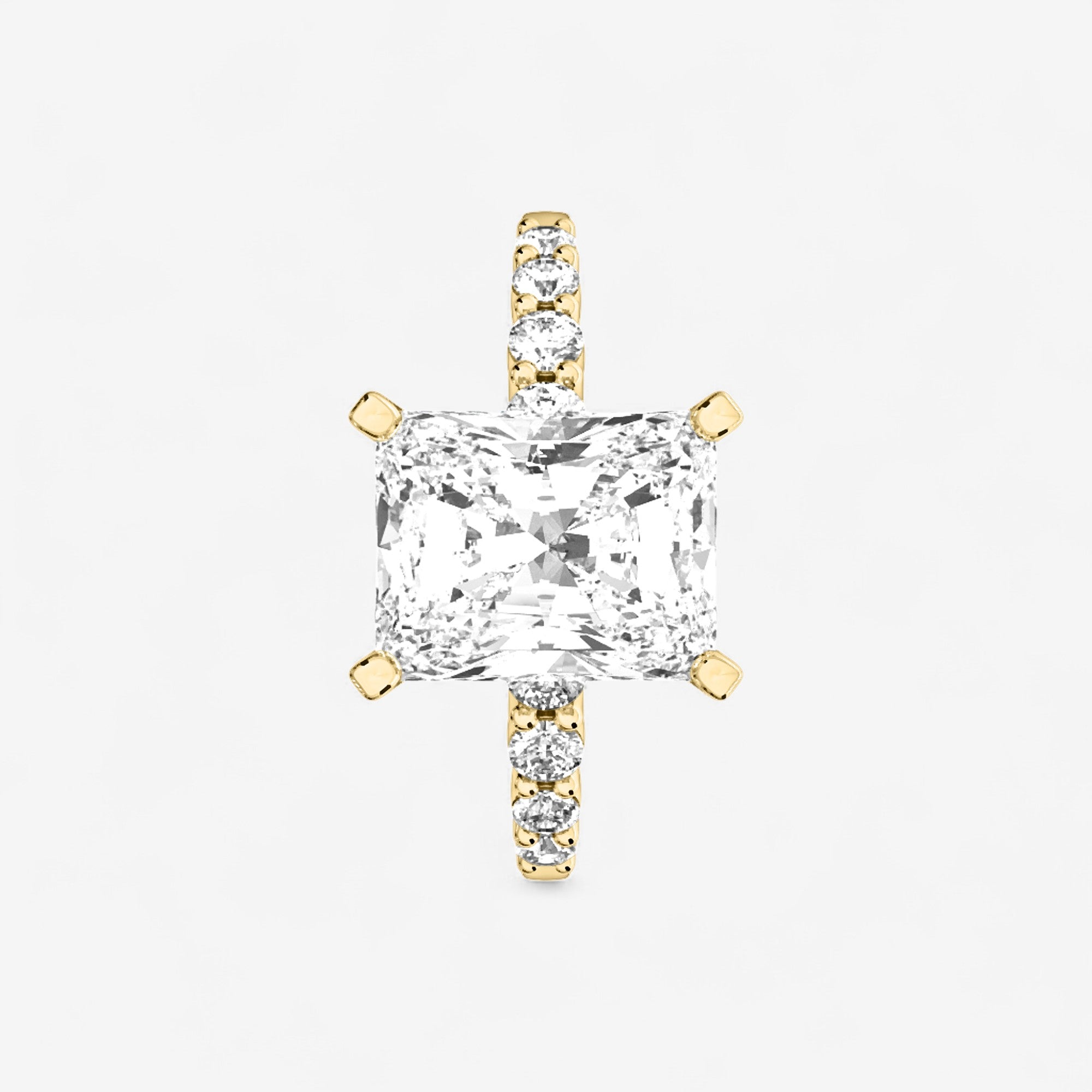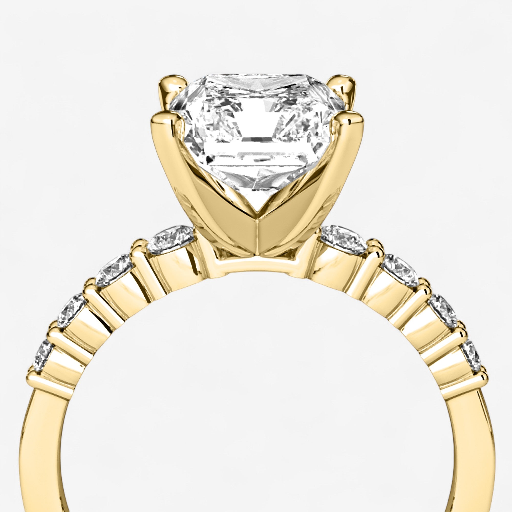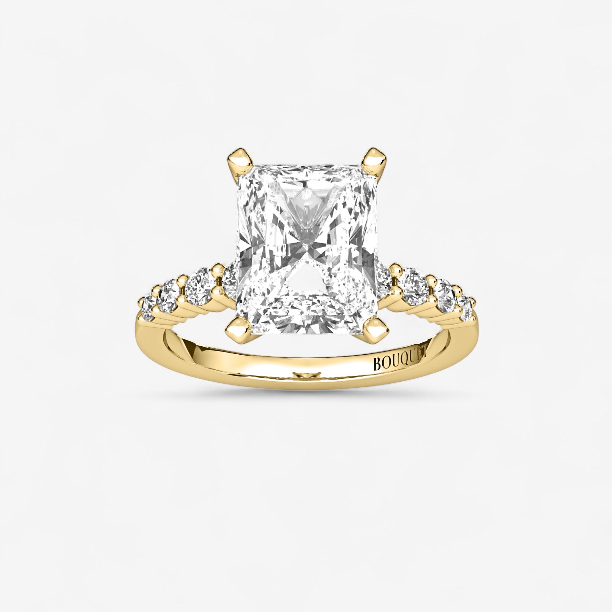 Exquisitely crafted, this gold ring features a refined arrangement of round lab-grown side stones that increase in size, producing a graceful flow of light towards the stunning radiant center stone. Each diamond is secured with a prong setting that amplifies its sparkle, shaping a silhouette that honors the beauty of shared memories. Its elegant design stands as a timeless tribute to lasting bonds.