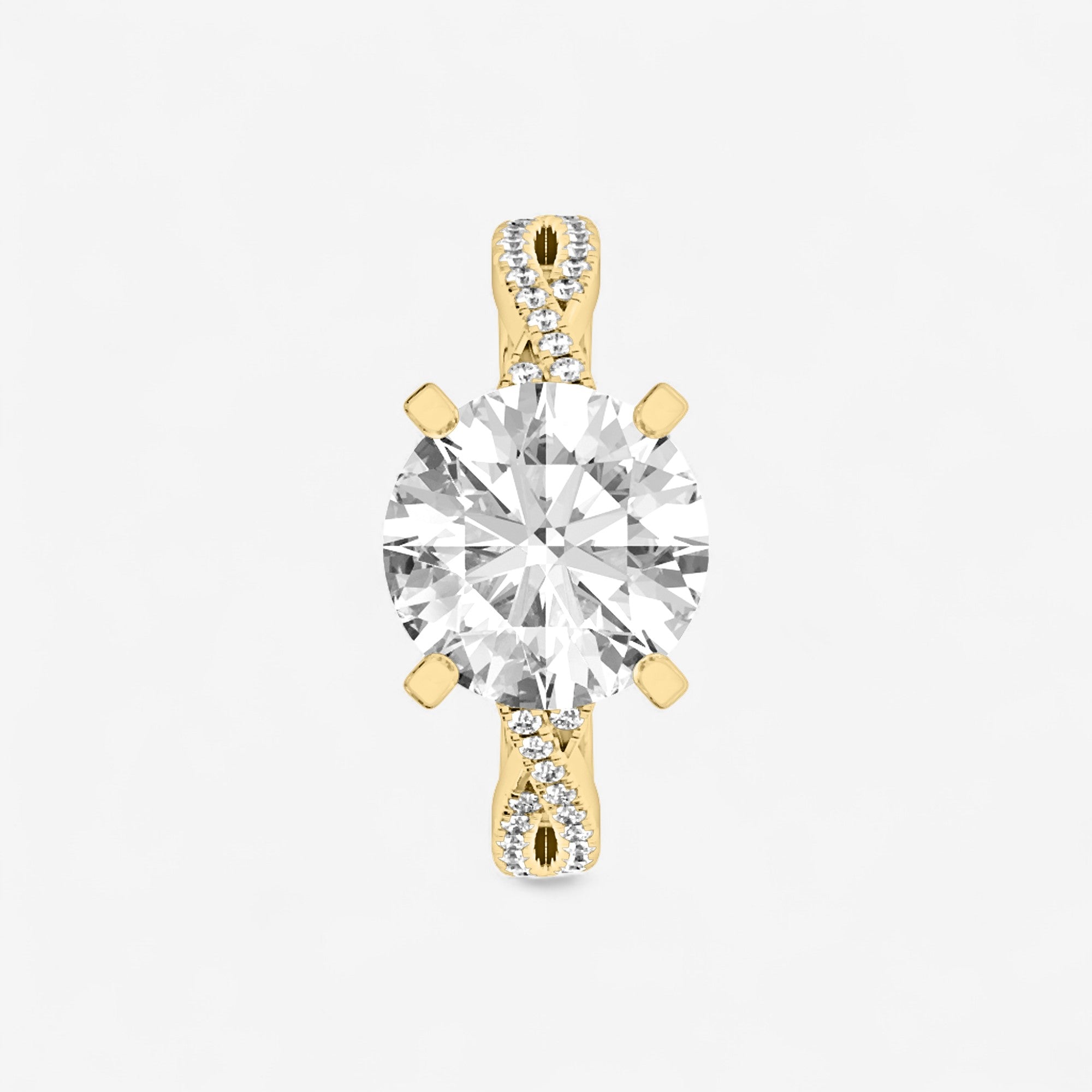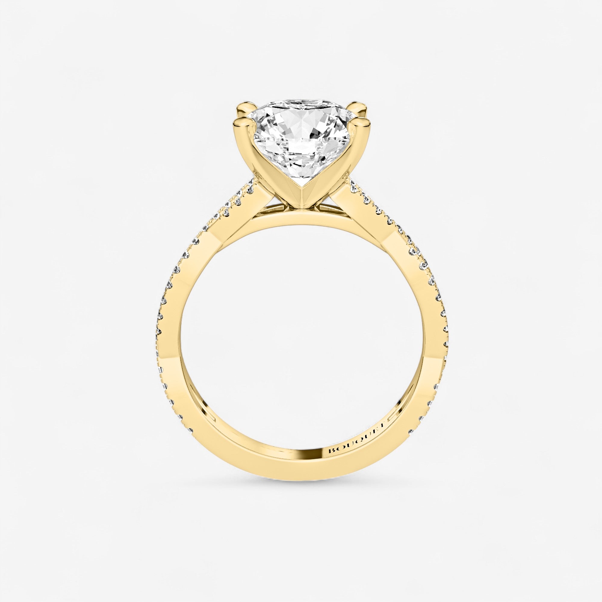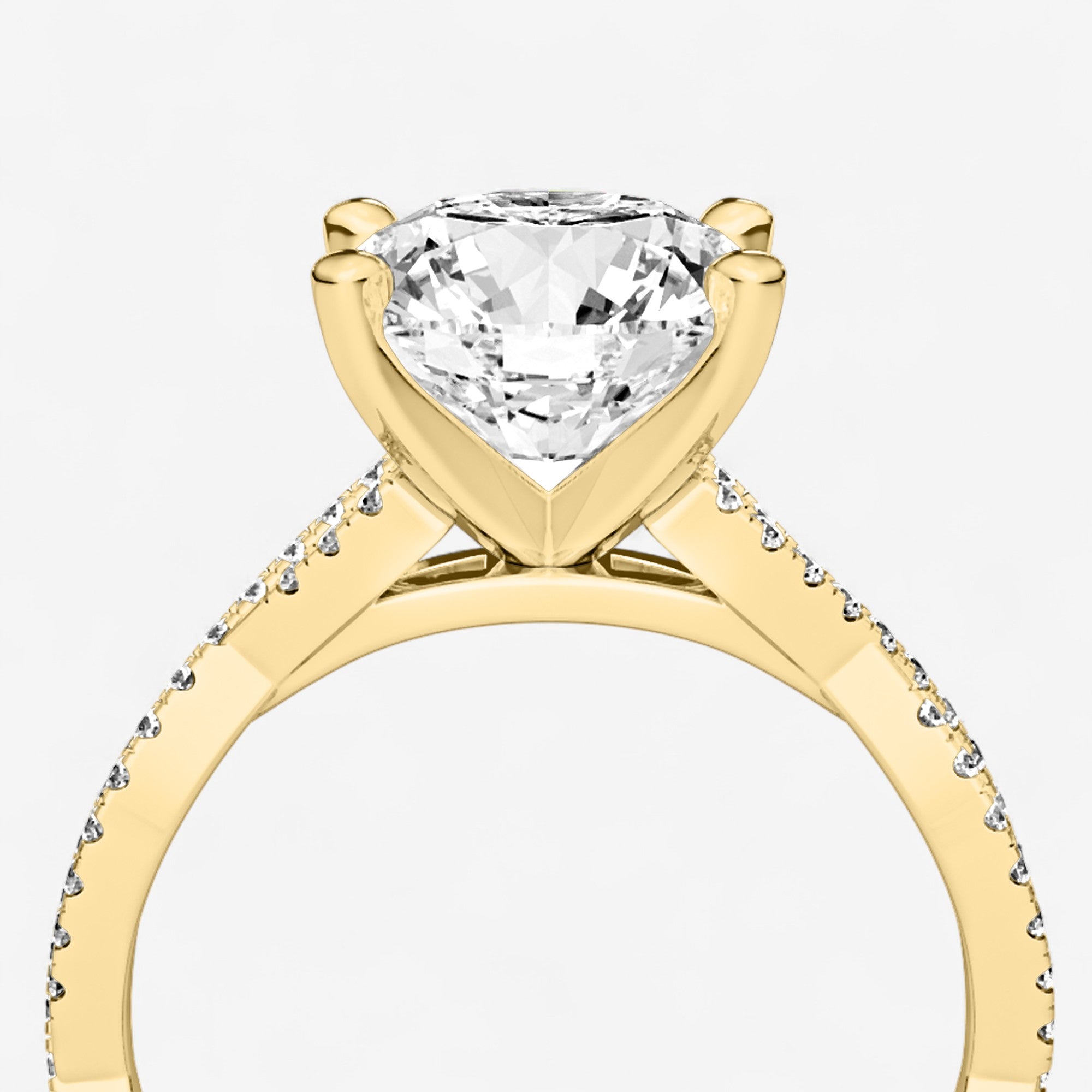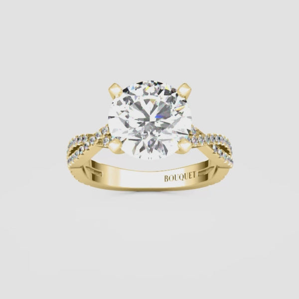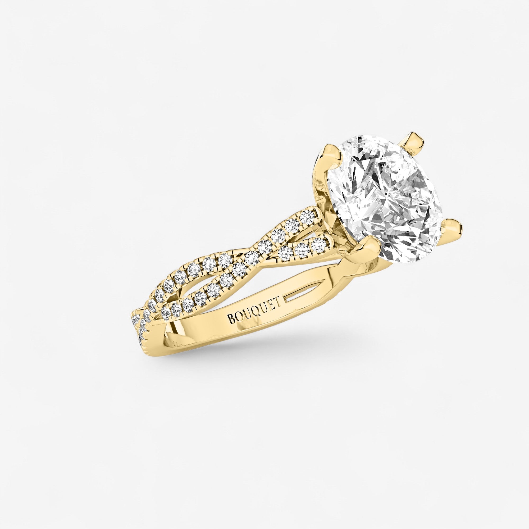 This exquisite gold ring features an elegant double twist design that seamlessly blends artistry with sophistication, each curve symbolizing a meaningful connection. Set with round lab-grown diamonds in a striking prong setting, this side stone engagement ring exemplifies refined craftsmanship, reflecting the enduring strength and beauty of a growing bond.
