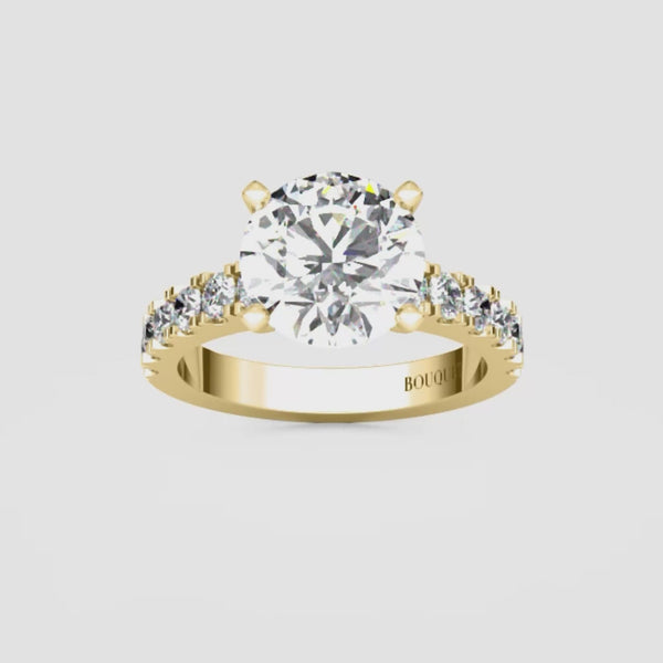 This exquisite engagement ring highlights a brilliant round center diamond set in classic gold or platinum, elevated by a row of sparkling side stones secured in a refined split prong setting. The split prongs allow for more light to enter each diamond, creating extra brilliance while giving the design a graceful, open look. Balancing timeless elegance with modern craftsmanship, this ring is a radiant expression of love designed to be cherished for a lifetime.